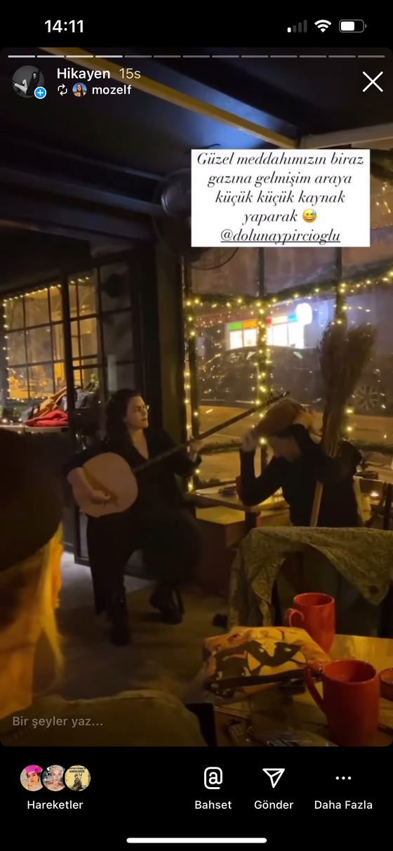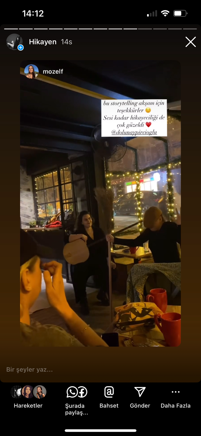 This time, there were people I didn’t know at all, and they weren’t aware that a performance would take place. Because of this, I constantly tried to feel the energy of the environment, making sure not to be too pushy or boring, while also staying clear and light-hearted. I balanced the weight of the topics with humor and a light tone in my storytelling. In the end, the feedback I received boosted my confidence in the project, and I realized that my vision of a modern female meddah had come to life.
