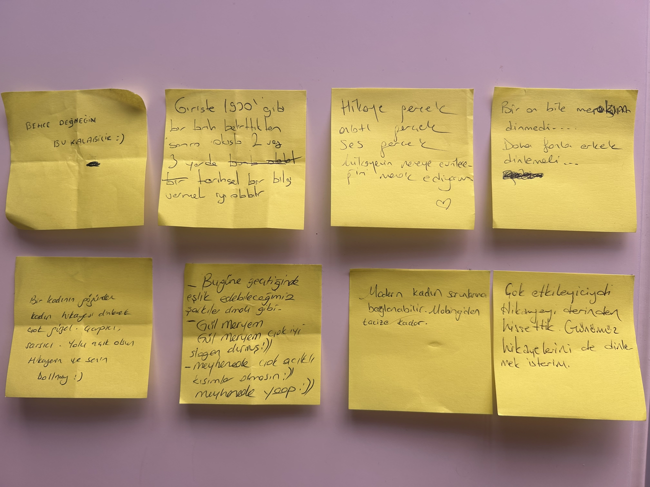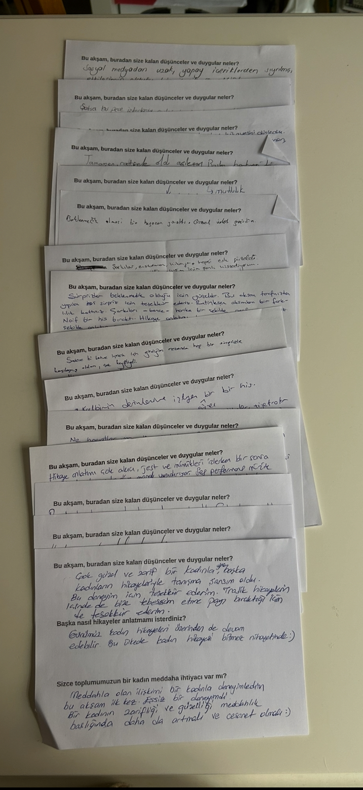 These feedbacks were generally about acting, the story, the performance, and the music. After the performance, I also received comments in these areas during our conversations. For my next performance, I will try a different method of collecting feedback to trigger audience to reflect on the idea of female meddah, women’s issues, gender and the emotions and thoughts that arise in the audience regarding these topics.