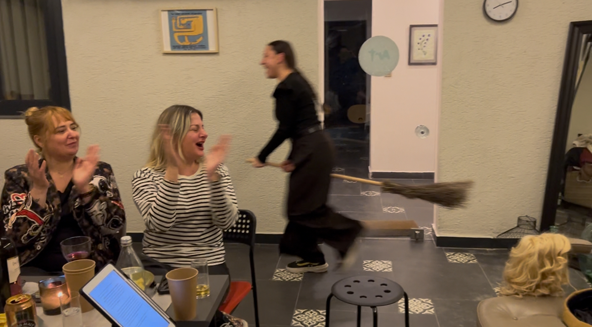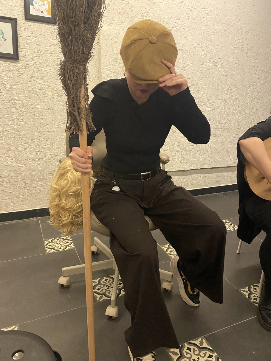 At this point, while making artistic choices regarding the props of the meddah performance, I started reflecting on my decision to use a witch’s broom. The concept of the witch is largely rooted in Western culture, and I realized that I could actually offer a feminist interpretation more grounded in Turkish culture. For this reason, I decided to focus on this prop in my upcoming experiment.