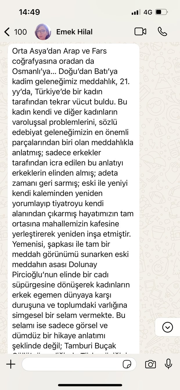 Since I couldn't access the script, I contacted her directly and explained that I was working in the field of female meddahperformance, and asked if she could share the script with me. She kindly sent it to me. Upon my first reading, what immediately stood out was that it was written in a distinctly masculine language.
