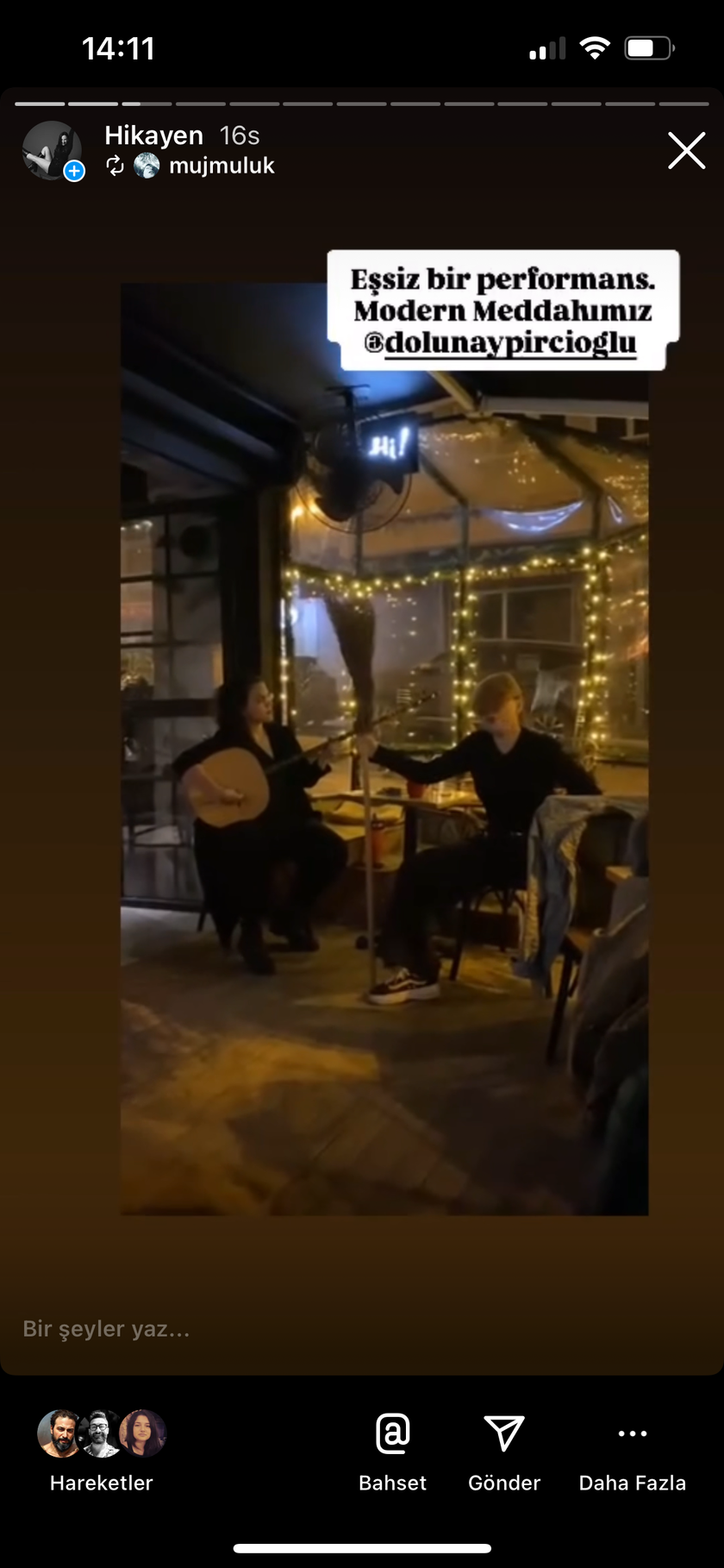 This was an unexpected and unplanned participation. In response, I spontaneously said, "Let’s all sing together, let it reach Meryem’s soul." As we know by now, improvisation is a part of the Meddah performance. So that helped me experience this improvisation aspect as a meddah. From that moment on, it really felt like we were singing for Meryem.
