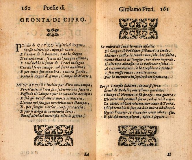 13. Preti, Girolamo. "Oronta". Poesie di Girolamo Preti. Al... Alfonso d'Este Prencipe di Modana. Ottava impressione, Dall' Autor corretta, ed accresciuta. Published by Guglielmo Facciotti, 1625. Digitised in full by the Lyon Public Library 1 March, 2012. Pp. 159-179 <https://play.google.com/store/books/details?id=KxVxrSwD14EC&rdid=book-KxVxrSwD14EC&rdot=1>
