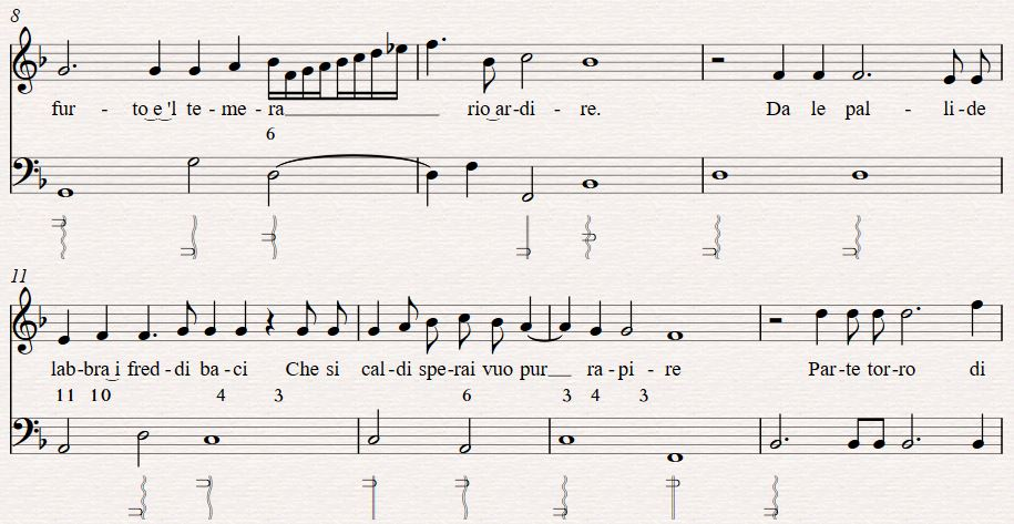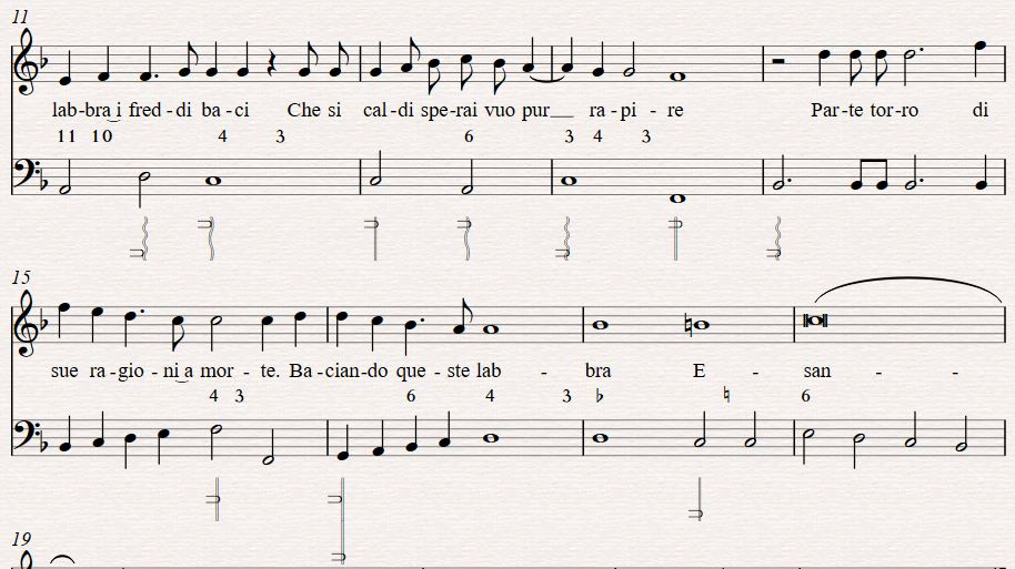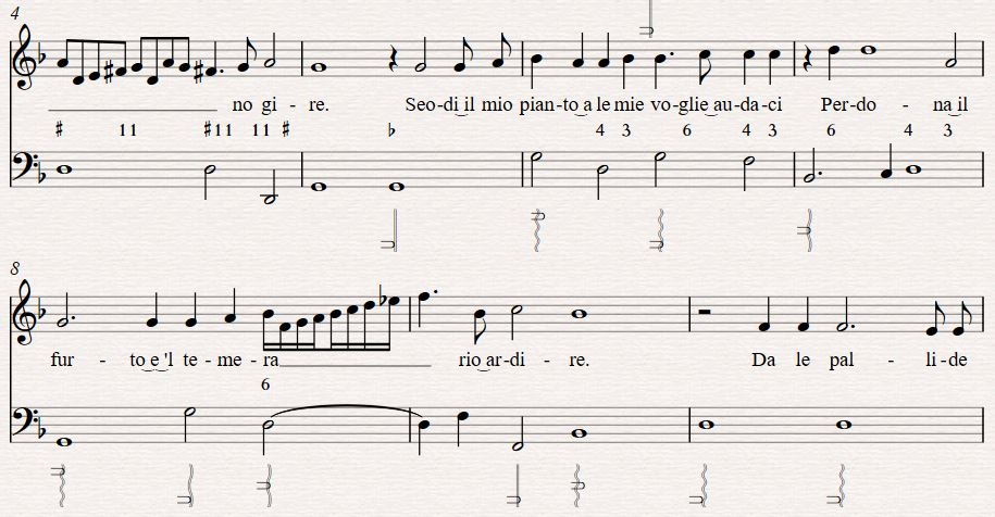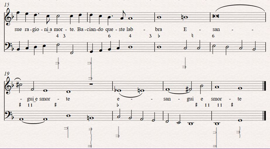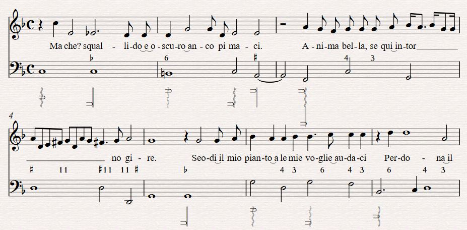 Thus begins our timbral realisation of “Ma Che? Squallido e oscuro.”1 This song was composed by d’India, with lyrics by the poet Tasso, both of whom wrote for the concerto delle donna, and originally published as a collection of other vocal soli which specifically mentions the arpa doppia in the title (Le Musiche Di Sigismondo D'india, Nobile' Palermitano: Da Cantar Solo Nel Clavicordo, Chitarone, Arpa Doppia Et Altri Istromenti Simili). The protagonist is a woman who has longed for a man who loved another. In this first line, she finds him dead on the ground, and still desires him physically. She kisses him, he is restored to life and goes back to his true love, the singer contented with the one kiss. Like Preti’s poem, the subject matter is jarring, dark and twisted. This is in order to focus on the sharp timbral contrasts in each phrase and the madness of those contrast as described in word painting of the time, and also to shed the preciousness of idyllic harp tone in favour of the original lyre accompaniment of epic poetry Seconda Prattica sought to emulate.