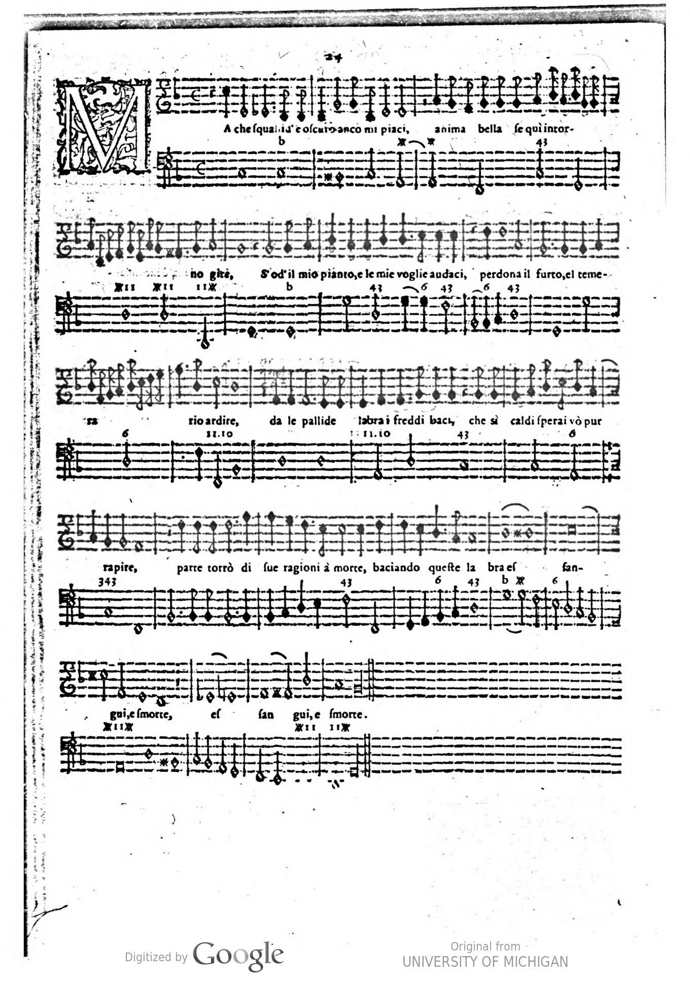 Figure 5.11—D'India, Sigismondo. “Ma Che? Squallido e oscuro.” Le Musiche Di Sigismondo D'india, Nobile' Palermitano: Da Cantar Solo Nel Clavicordo, Chitarone, Arpa Doppia Et Altri Istromenti Simili. Milano: Appresso l'herede di Simon Tini, & Filippo Lomazzo, compagni, 1609. Musical score. Digitised by the University of Michigan.