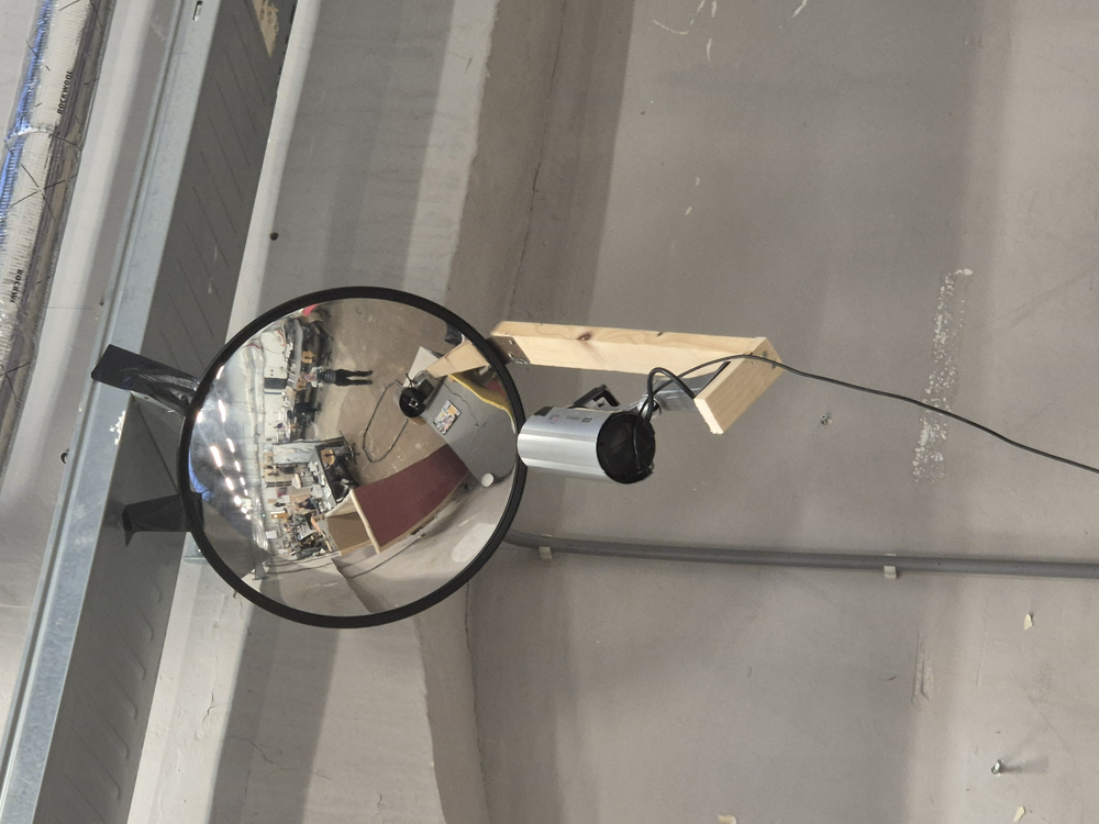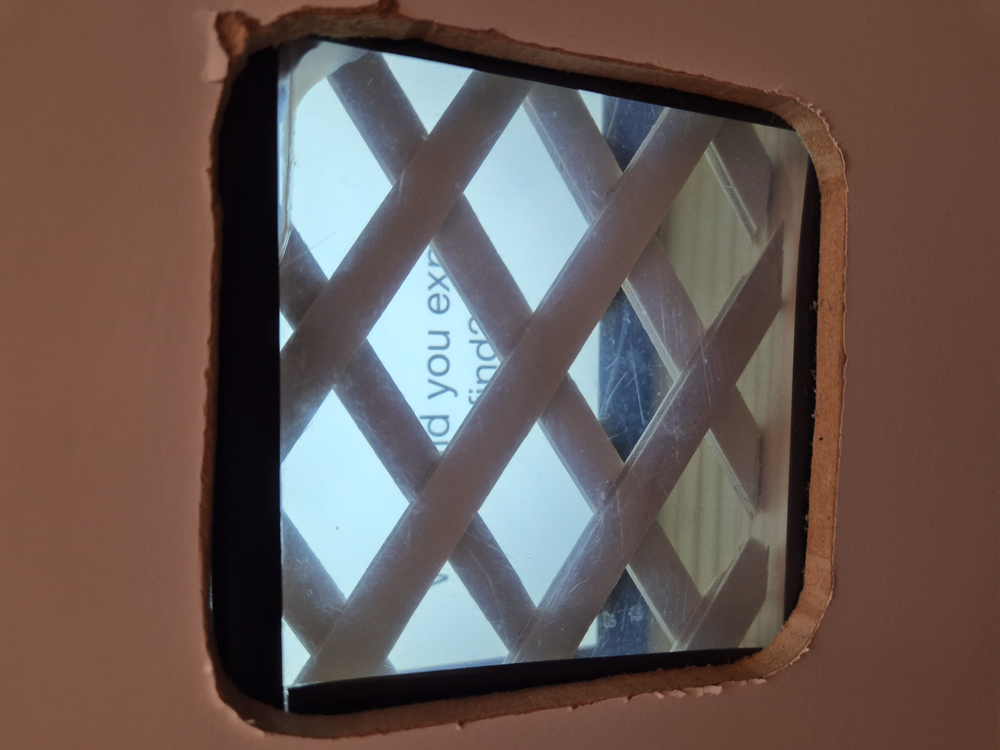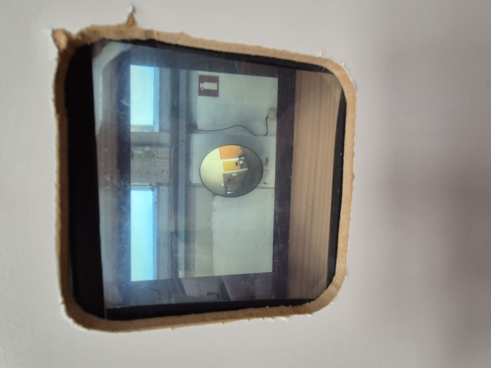 In SYP Presentation (Fine Arts Mirror), I used the peepshow device for a group of Fine Arts students. I displayed an ambiguous, low-quality image of a surveillance mirror from their studio, making it unclear if the image was live or recorded. To heighten the effect, I placed a similar mirror in the presentation space, mirroring the view shown on the screen. This setup created complex interactions, as each participant’s unique relationship to the spaces and mirror affected their experience. This experiment highlighted how ambiguity, paired with personal associations, can shape how people experience surveillance and watching.