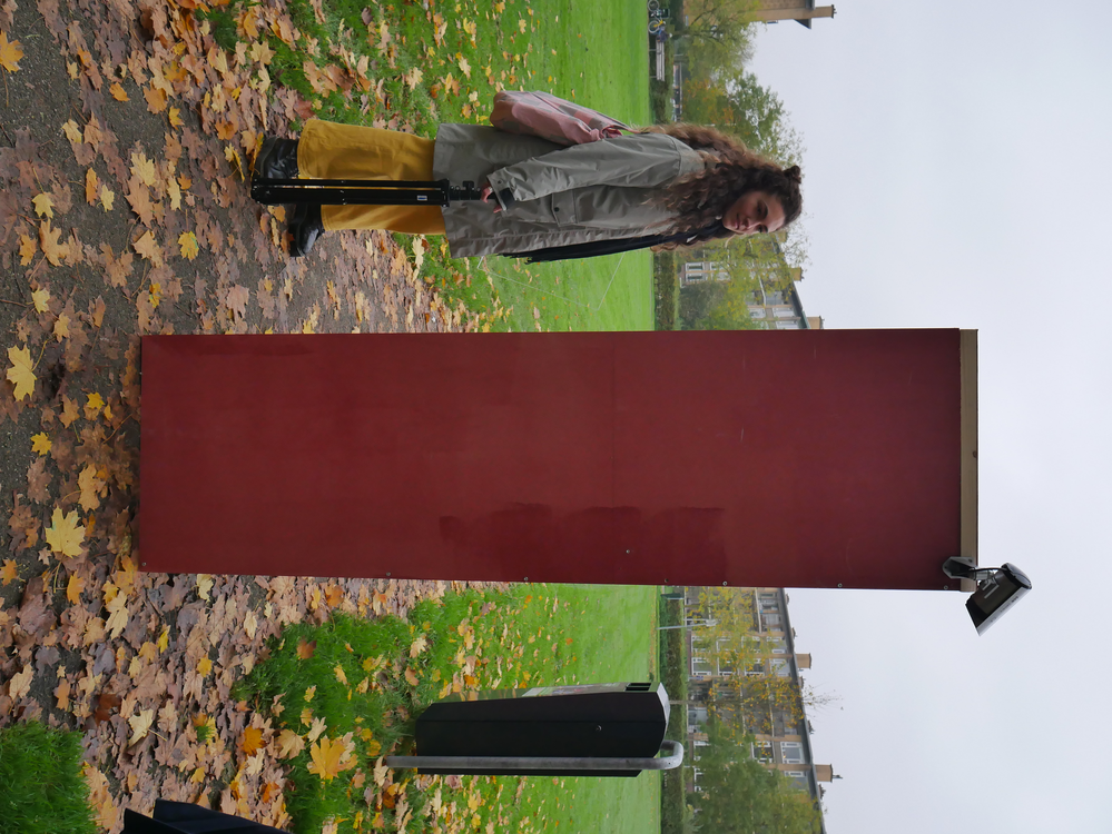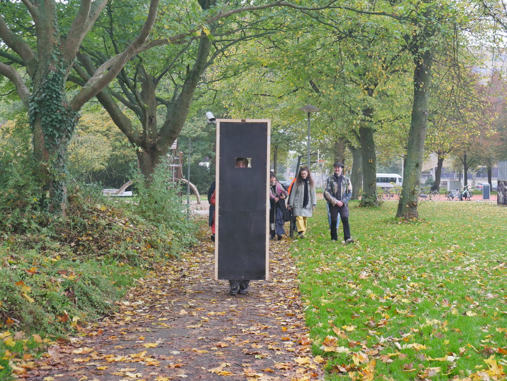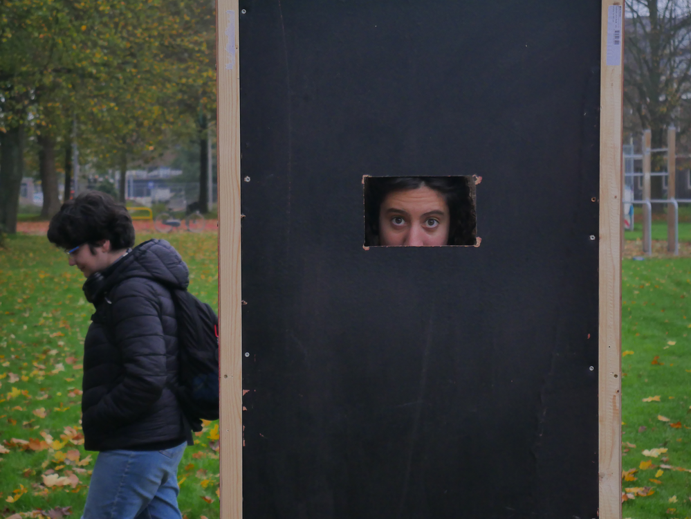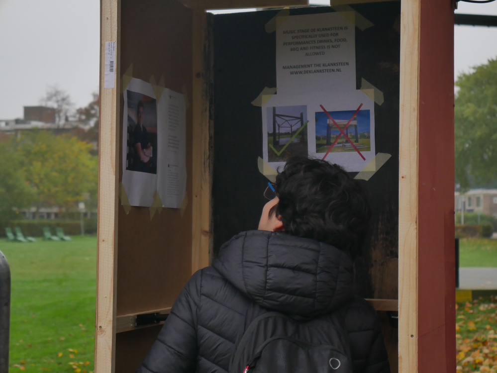 For Public Space Surveillance Workshop (Klanksteen), I experimented with public space directly by staging a surveillance setup around the Klanksteen, an open structure with restricted access and enforced rules. I created a watch post in the park facing the structure, aiming to explore the absurdity of open spaces governed by strict, often arbitrary, restrictions. Here, I realized my interest in surveillance and control in public spaces, especially how these spaces can be perceived as open but are strictly monitored. This setup emphasized the absurdity of controlled environments and the layers of watching involved.