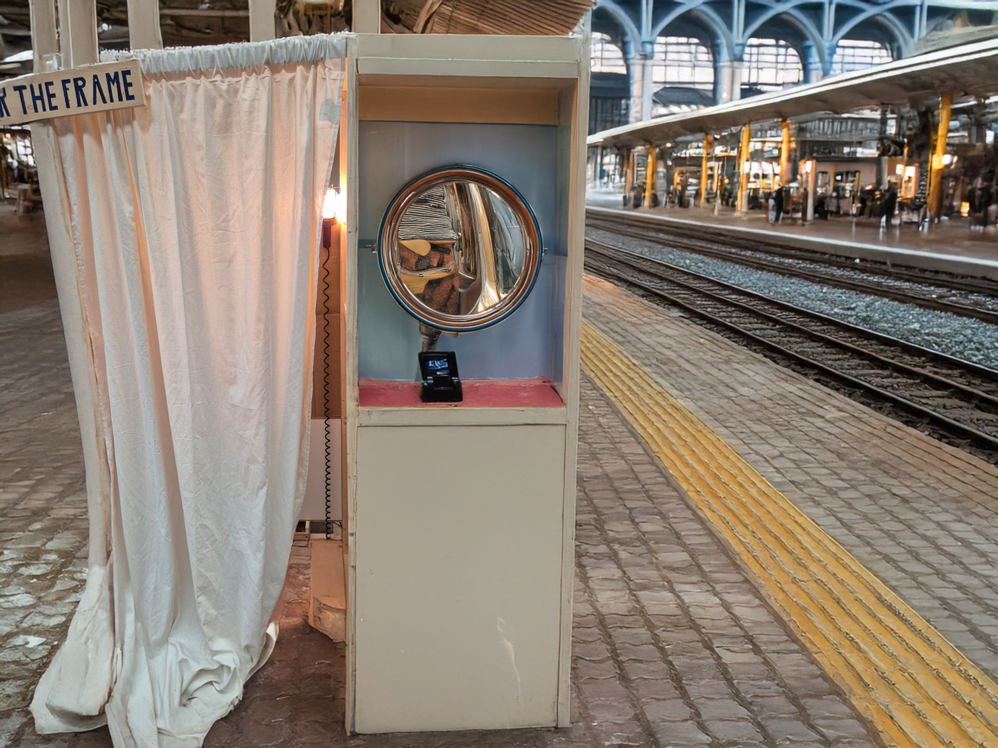 In this iteration, Enter the Frame, I returned to the studio environment, refining the setup to emphasize attention and control. The device was placed in a central location, accompanied by a glowing arrow to direct spectators’ focus. The content shown through the peepshow was a live camera feed capturing the perspective of a surveillance mirror, creating a looped image of watching and being watched. Unlike previous experiments, I locked the coin mechanism, ensuring that participants would not receive their money back, prompting them to consider the value of their curiosity.