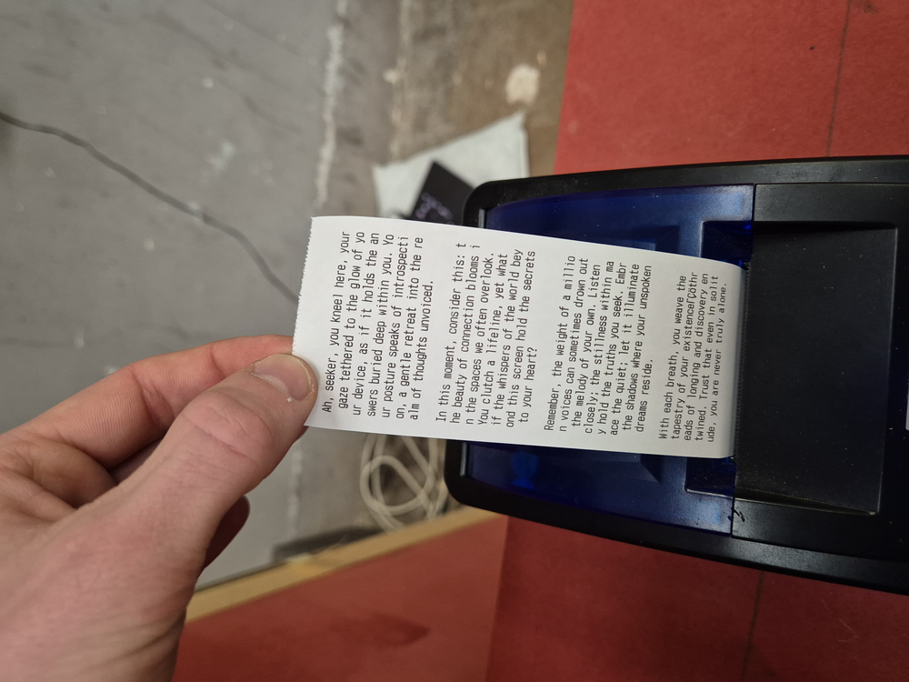 The introduction of the AI-generated receipt in Biecht provided a turning point. By offering participants a speculative, poetic reflection based on their captured image, the peepshow created a narrative resolution while maintaining ambiguity. The receipt acts as both a physical artifact and a conceptual bridge, extending the experience beyond the immediate interaction. It embodies the “and then”—a resolution that is not a solution but a space where meaning emerges through participation.