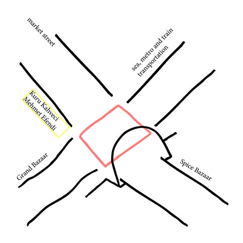 This 12 square meter area is at the intersection of four roads. One side leads to Sirkeci, where sea, metro and train transportation are provided; one side to the Spice Bazaar, built in 1664 and visited by an average of 500,000 people a day; one side to the Grand Bazaar, which has existed since the Byzantine period and visited by 400,000 people a day; and the other side to the actively continuing market street. At the same time, Kuru Kahveci Mehmet Efendi, whose shop has been on the corner since 1871, is located. Therefore, this 12 square meter area is actually where all this crowd passes together.