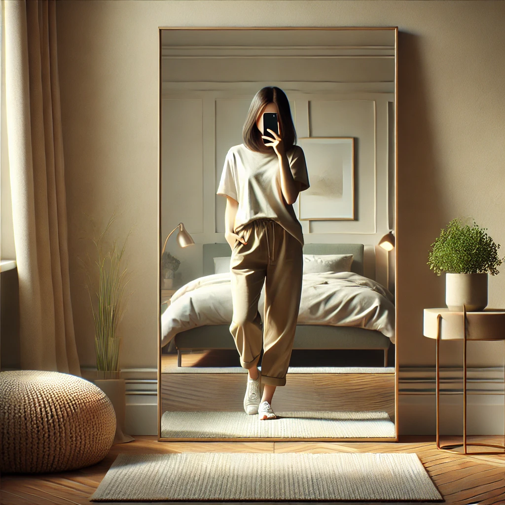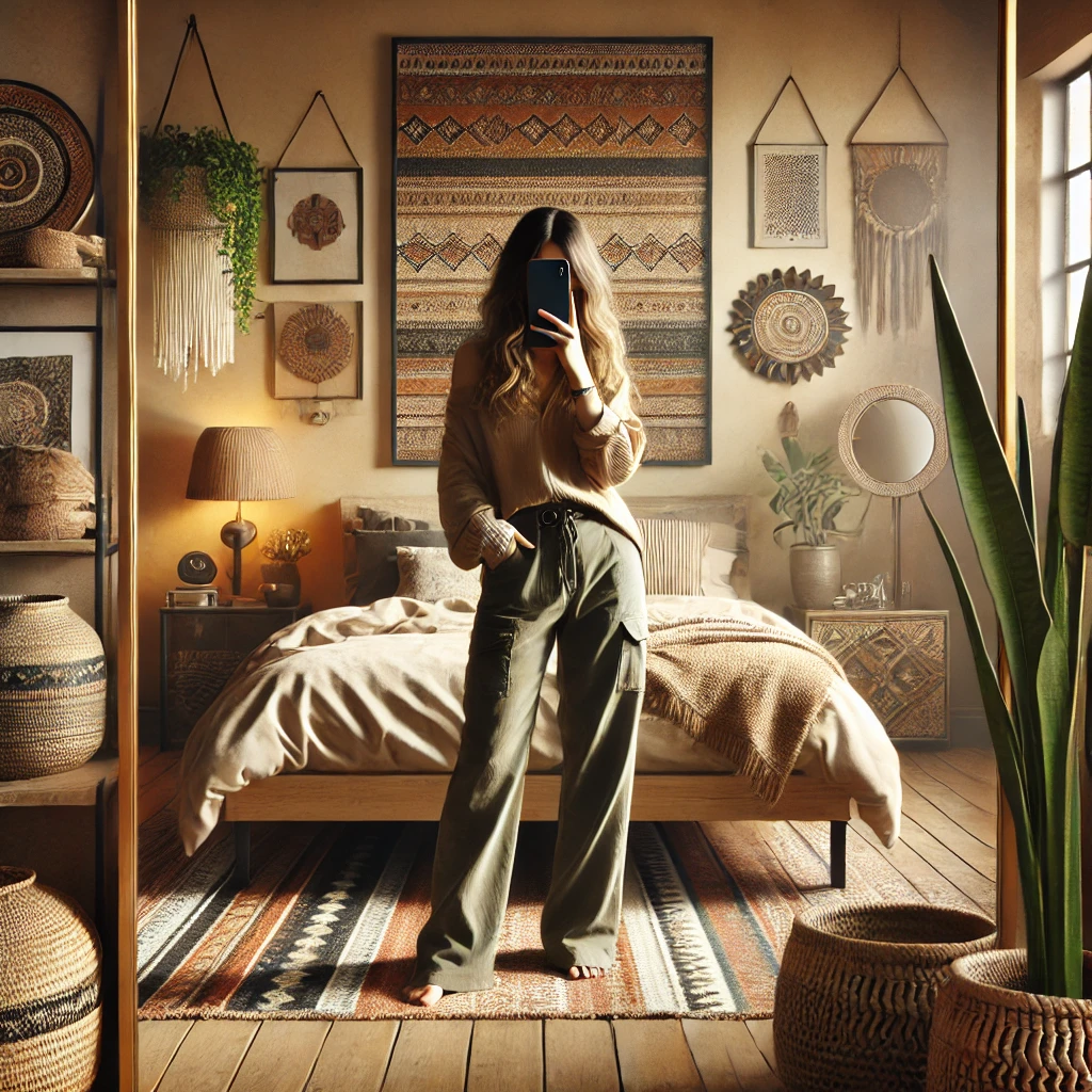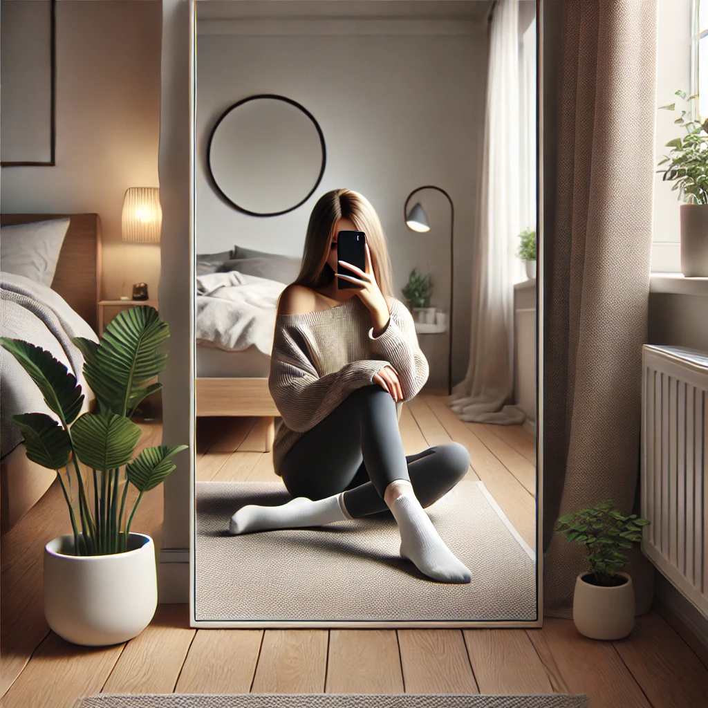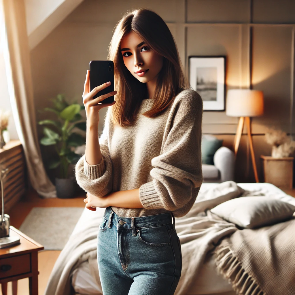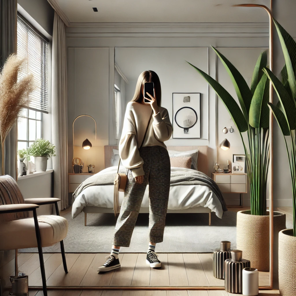 I decided to verify the recurring patterns that I observed in images on the Pinterest platform and that were confirmed by data and analysis through artificial intelligence methods in a third way. I used ChatGPT to generate 150 mirror selfies to find out whether the images would correspond to the most common compositions and color schemes and whether individual interior elements and poses of the authors would be repeated. The result was surprising, as the vast number of images turned out exactly as if they had been downloaded from Pinterest. Although these photos have not been analyzed again in the same way, from mere observation I note similar color schemes, the placement of furniture elements, repetitive poses and the moment of covering the face with a mobile phone. The style is mostly minimalistic with bohemian elements, light colors and natural materials that give the room a cosy, casual and pleasant feel.
