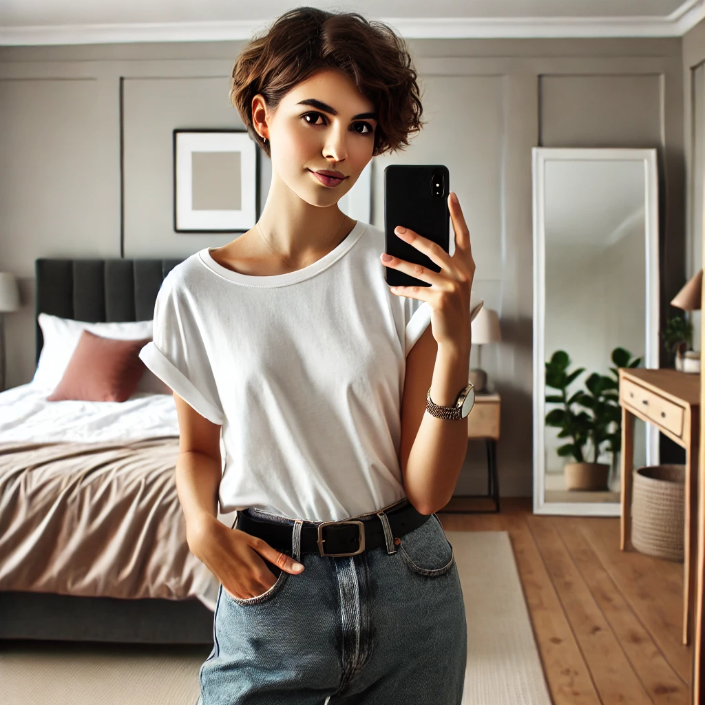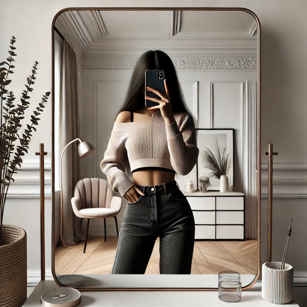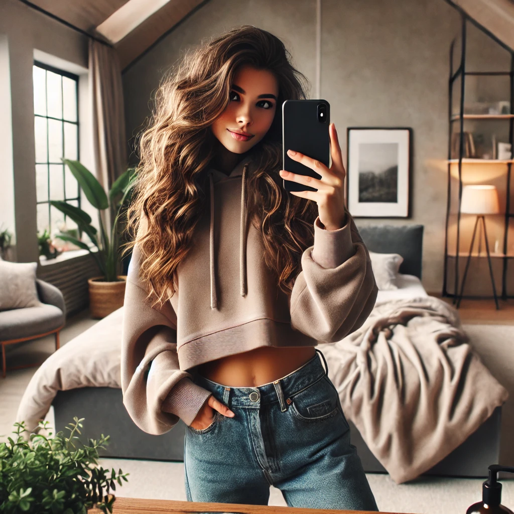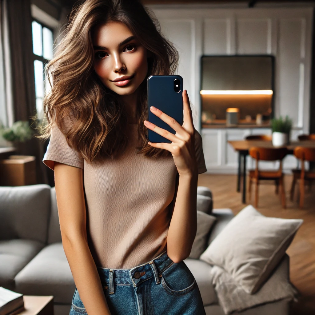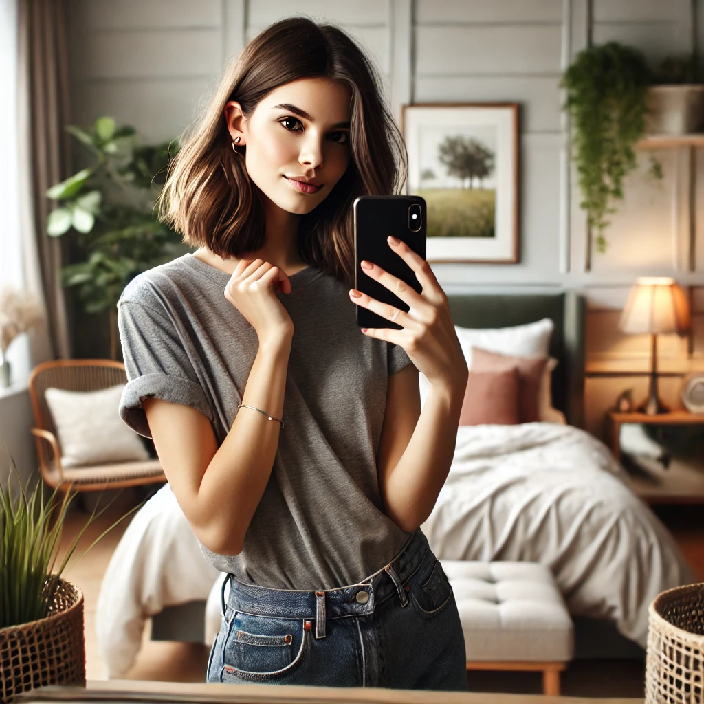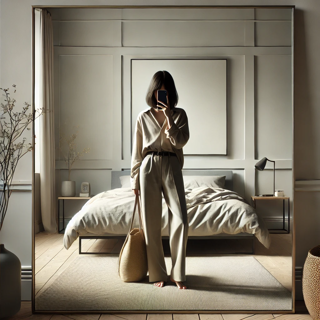 I decided to verify the recurring patterns that I observed in images on the Pinterest platform and that were confirmed by data and analysis through artificial intelligence methods in a third way. I used ChatGPT to generate 150 mirror selfies to find out whether the images would correspond to the most common compositions and color schemes and whether individual interior elements and poses of the authors would be repeated. The result was surprising, as the vast number of images turned out exactly as if they had been downloaded from Pinterest. Although these photos have not been analyzed again in the same way, from mere observation I note similar color schemes, the placement of furniture elements, repetitive poses and the moment of covering the face with a mobile phone. The style is mostly minimalistic with bohemian elements, light colors and natural materials that give the room a cosy, casual and pleasant feel.