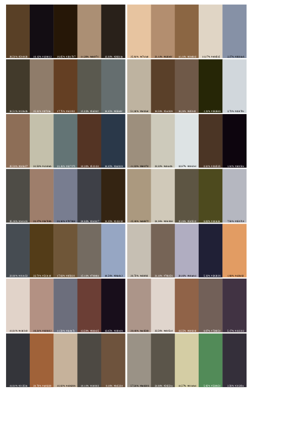 This part of the analysis aimed to generate two color palettes for each image, which will consist of the five most common shades for the interior and the figure separately. Skin color is part of the character's color scheme, which is why the colors of the clothes correspond to only 4 shades in reality.