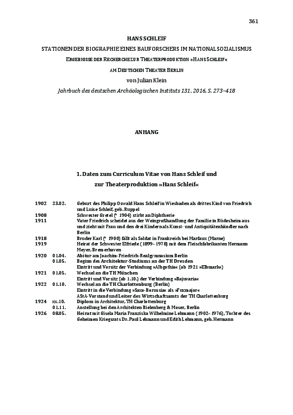 Among the members of the Archaeological Institute of the German Reich, the architectural historian Hans Schleif was notable for the extent of his involvement with the crimes of the National Socialist regime. His achievements in scientific research, for instance as director of excavations at Olympia, are over¬shadowed by his career in the SS. He was director of the Excavation Department of the »Ahnen¬erbe« (ancestral herit¬age) of the SS. After the German invasion of Poland he was briefly appointed Custodian of German Cultural Assets based in Posnan. In 1943, he joined the SS Head Office for Economic and Administrative Af¬fairs and rose to the position of deputy to C Group (Construction) director, Dr. Hans Kammler, whose permanent representative in the Jäger- und Rüstungsstab task force he became. In this role, Schleif was responsi¬ble above all for moving key arms production facilities underground, where fighter planes and the »reprisal weapons« V1 and V2 were built – hence for the largely subterranean concentra¬tion and slave labour camps of the Sonderstab Kammler. His grandson, the actor Matthias Neukirch, created a theatre production about Schleif in collaboration with stage director Julian Klein at the Deutsches Theater Berlin. This text is a result of the research undertaken for the production, and reports on selected stages in Schleif’s biography. This are the addenda and the register of the publication in the yearbook of the German Archaeological Institute, No. 131, 2016.