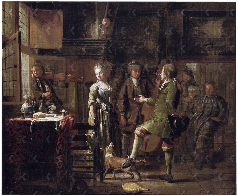 Maximiliaan Blommaert, Tavern interior with string instrument players and a dancing man, Antwerp, 1695.