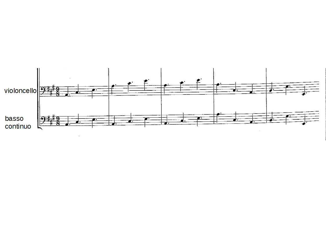 The violoncello leaves the basso continuo group for a soloistic line. In some of the VI Concerti this is the case for a full movement, such as the third movement of the Concerto III. In other ones the solo is just a section within a movement.