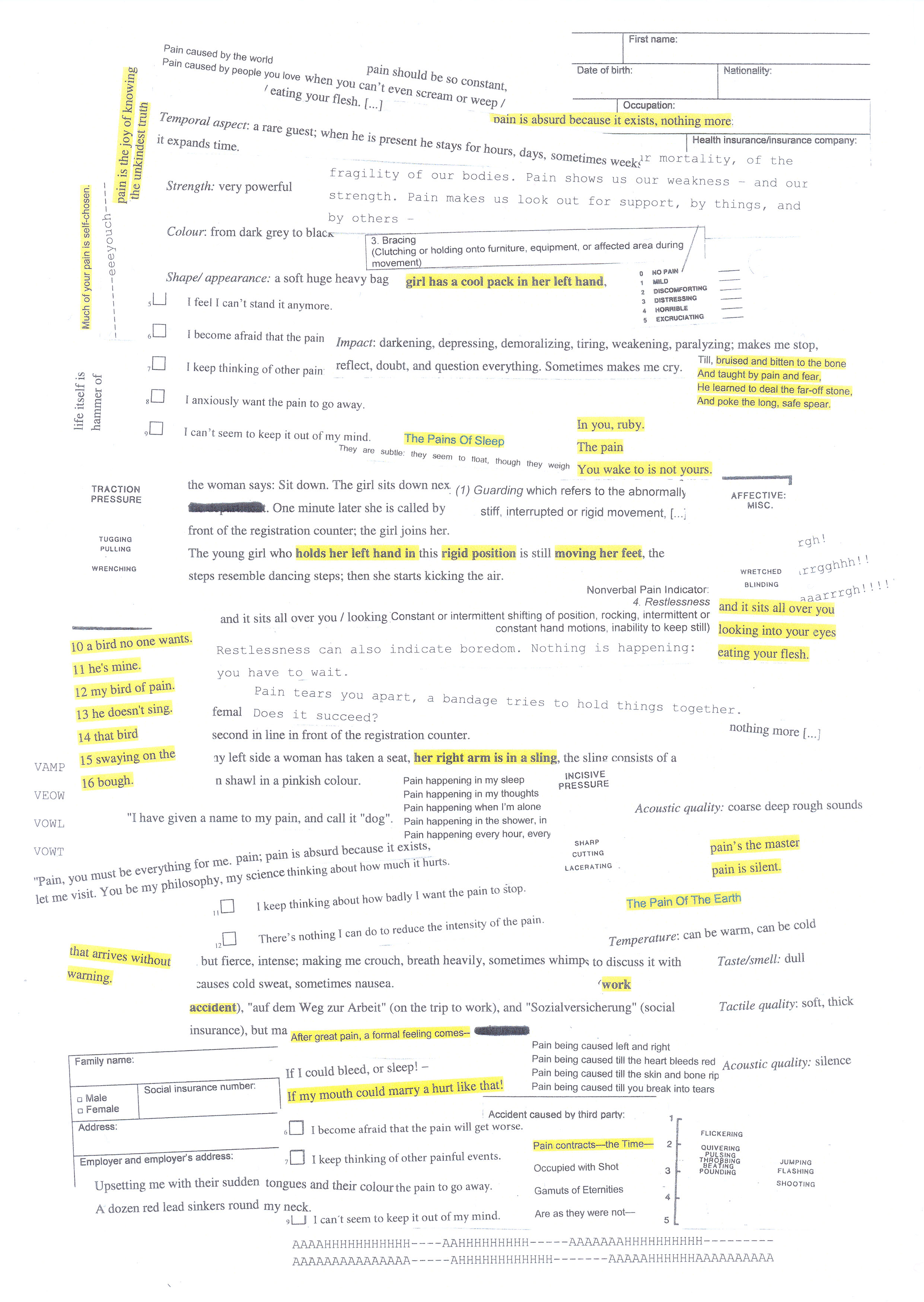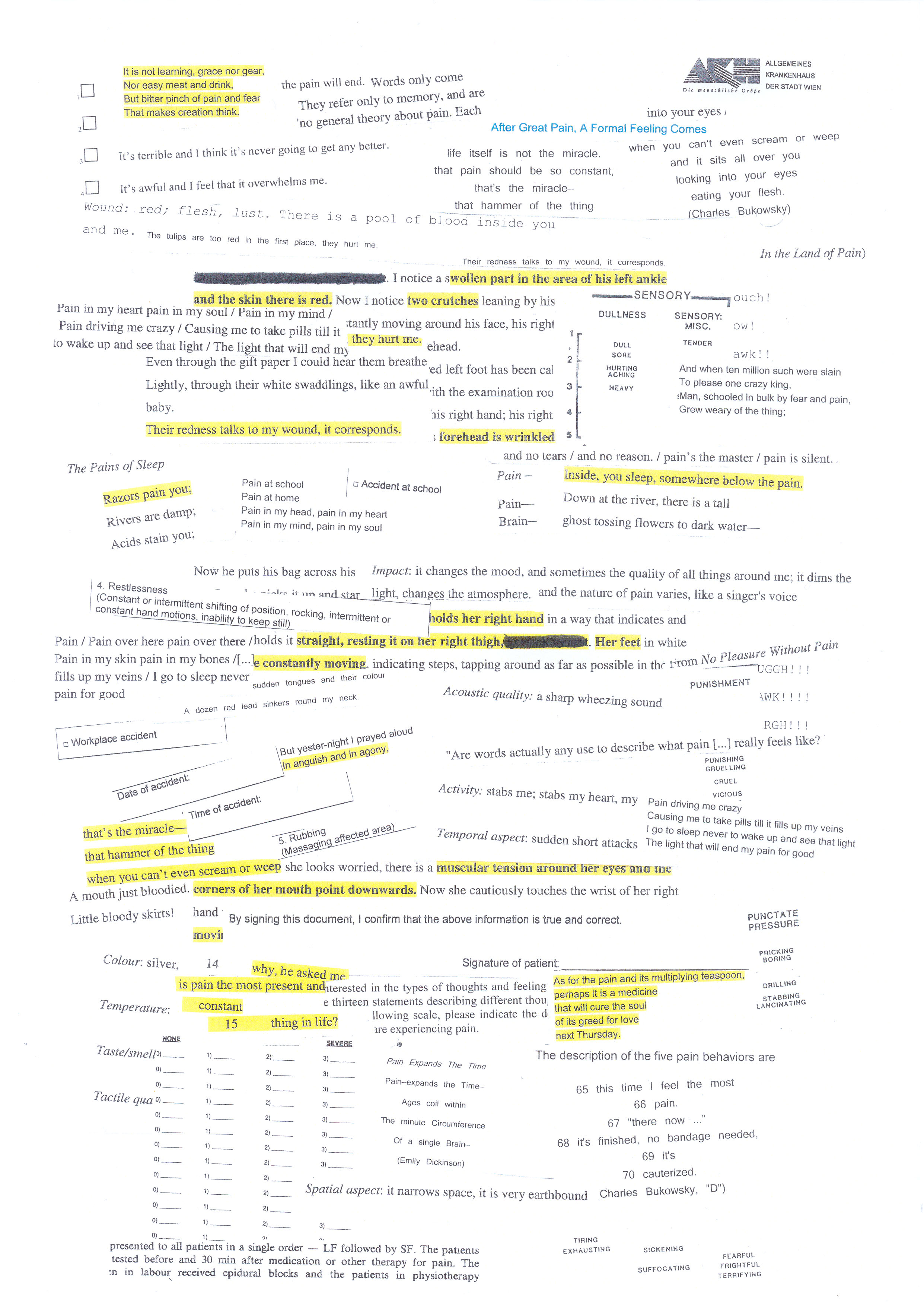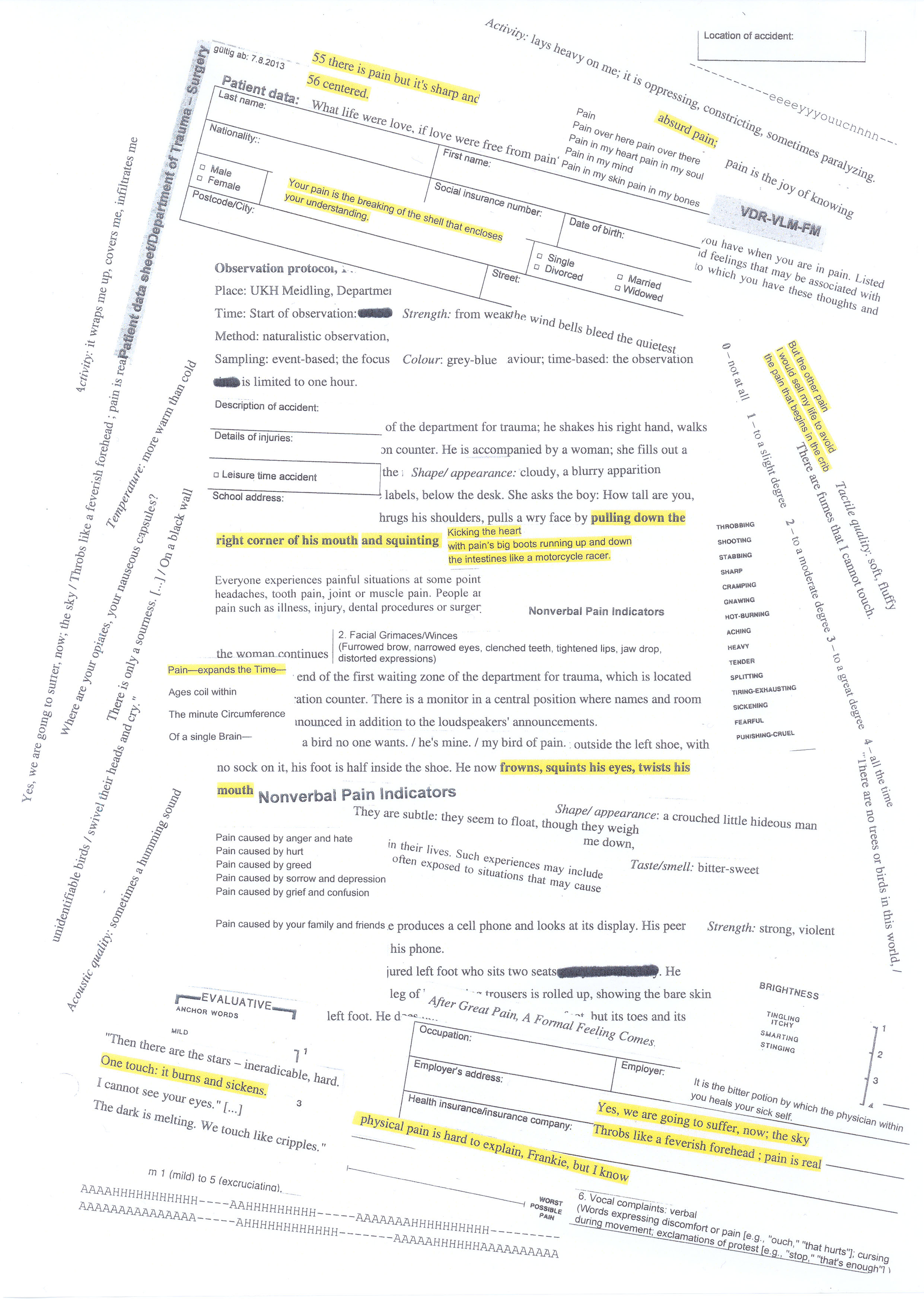 The assemblage consists of different types of texts: clippings from the protocols I obtained from my methodical observations in hospitals, questions from pain questionnaires, poem lines, passages from my diary concerning my own pain experiences, interviews with experts on pain, philosophical essays, and studies published in scientific journals.