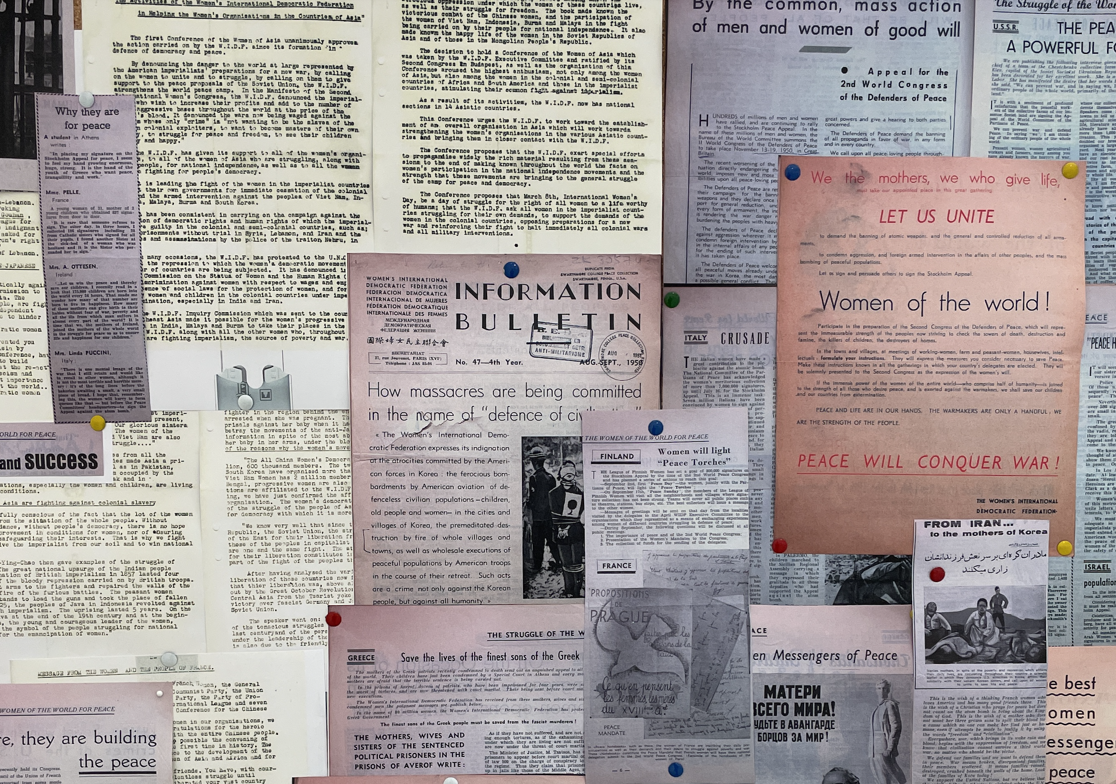 The printed matters displayed in the exhibition at greengrassi, We will move to the land of birds as a flock of previous humans, curated by the Otolith Collective, offered a factual and document based reading as well as an imaginary and personal visualisation of feminist world-making and organising. It takes the little-known Women’s International Democratic Federation or WIDF as its starting point and dramatises moments of the tactics and strategies of anti-imperialist internationalism deployed by WIDF at the height of the Global Cold War from 1945 until 1963, and travels with the academic research of Elisabeth B. Armstrong and her most recent publication Bury the Corps of Colonialism The Revolutionary Feminist Conference of 1949 (2023) as a companion.