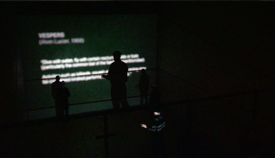 PLAY used the score of Vespers as a structural element, an interlude between the four sections of the work. Its text-score was projected onto the wall, while the brass players laid down their instruments to explore the dark rooms blindfolded. Using the clickers, they slowly moved throughout the spaces, at times clumsily bumping into one another or the walls.