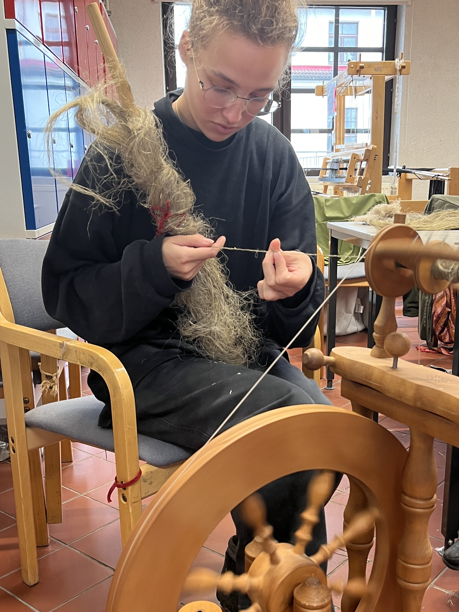The yarn is rough but it is spun by students that had their first time working with a spinning wheel. This is a very good result and the fact that the fibers are also grown and processed by the students makes the material even more valuable.