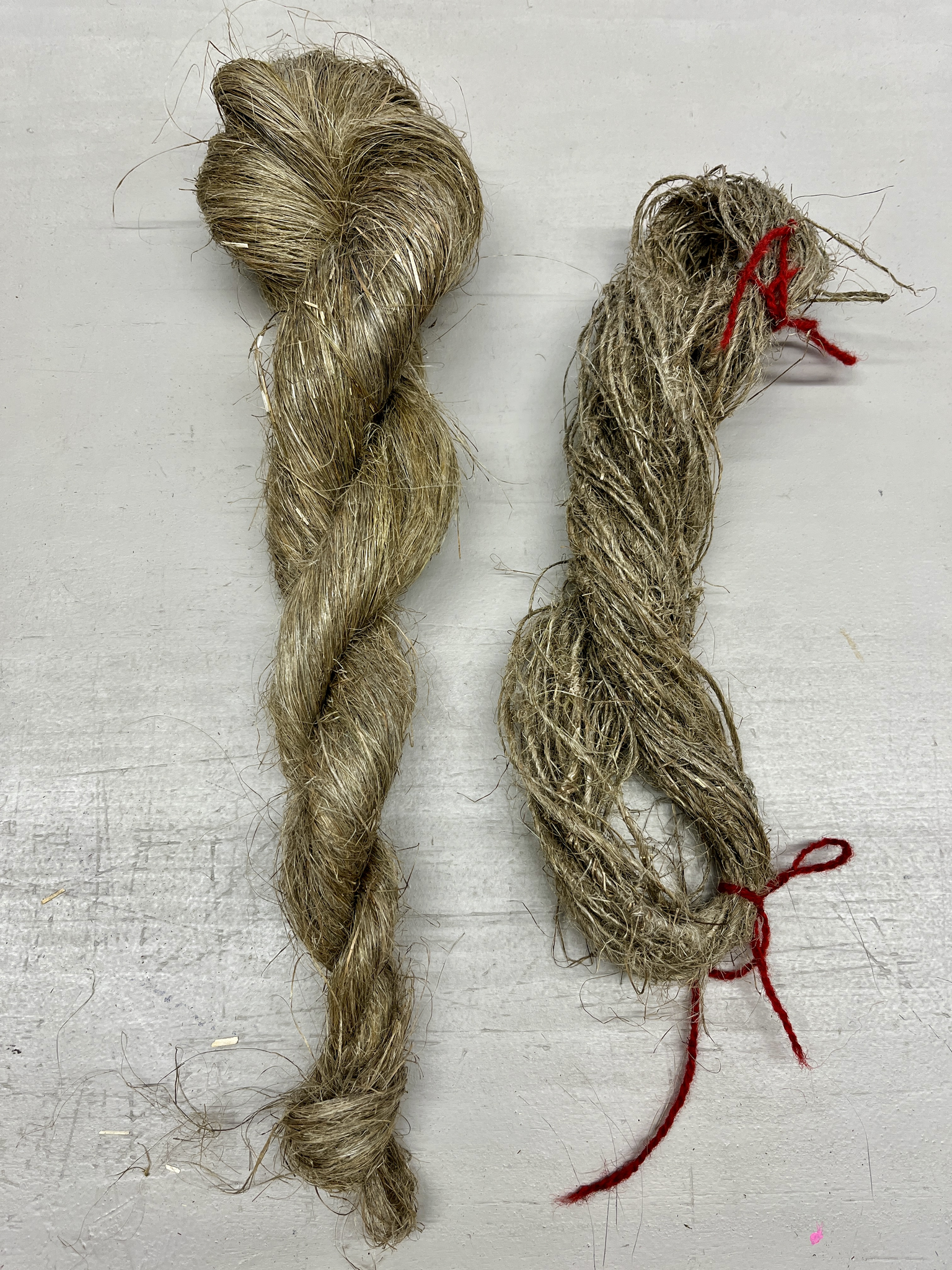 Flax fibers grown in Estonian Agricultural Museum, processed and spun into yarn by textile students from Pallas University of Applied Sciences in 2024.