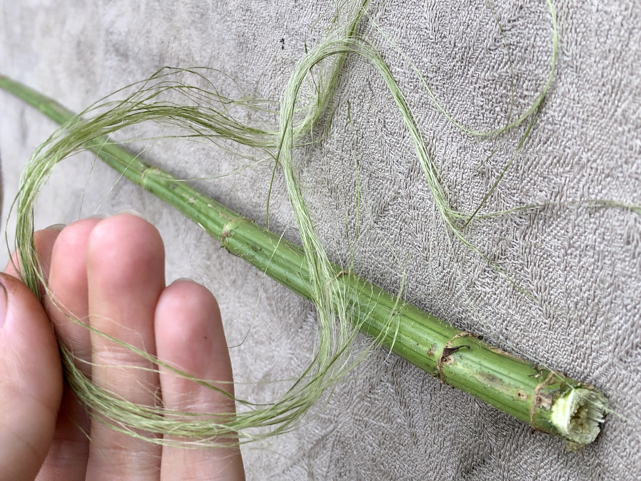 You can get really interesting material by simply peeling the outer layer off the wooden inside, separating the fiber bundles into thinner strips and spinning them into two-ply cordage.