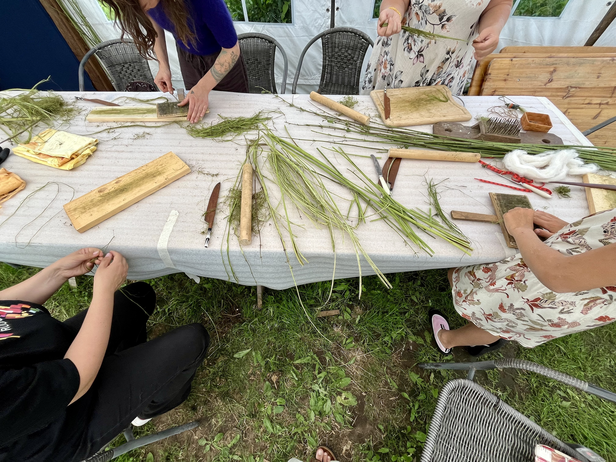 I have to mention that a very important component in a successful nettle fiber precessing is correct timing. Nettle stalks usually start to contain fibers after they have produced seeds, which happens here in the beginning of June. In my experience, June and the beginning of July is the best time for fiber processing, because then the fiber containing outer layer peels off the woody inside more easily. This means that the stems are wet and it is easier to separate the fibers. I have experienced that at the end of July and in August the nettle stems are dry and strong which makes it more difficult to separate the fibers. It is reasonable to make the laborous work easier with a correct timing.