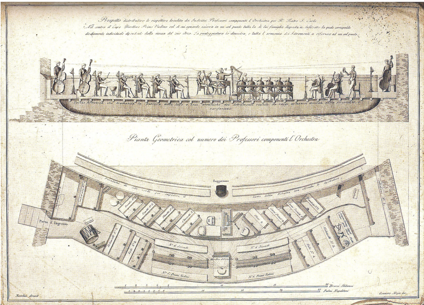 Image 13. arrangement of the orchestra at the San Carlo theater. Tiziana Grande, "La Scuola Arpistica Napoletana tra Otto e Novecento," http://www.associazioneitalianarpa.it/la-scuola-arpistica-napoletana-tra-otto-e-novecento/, accessed February 3, 2025.