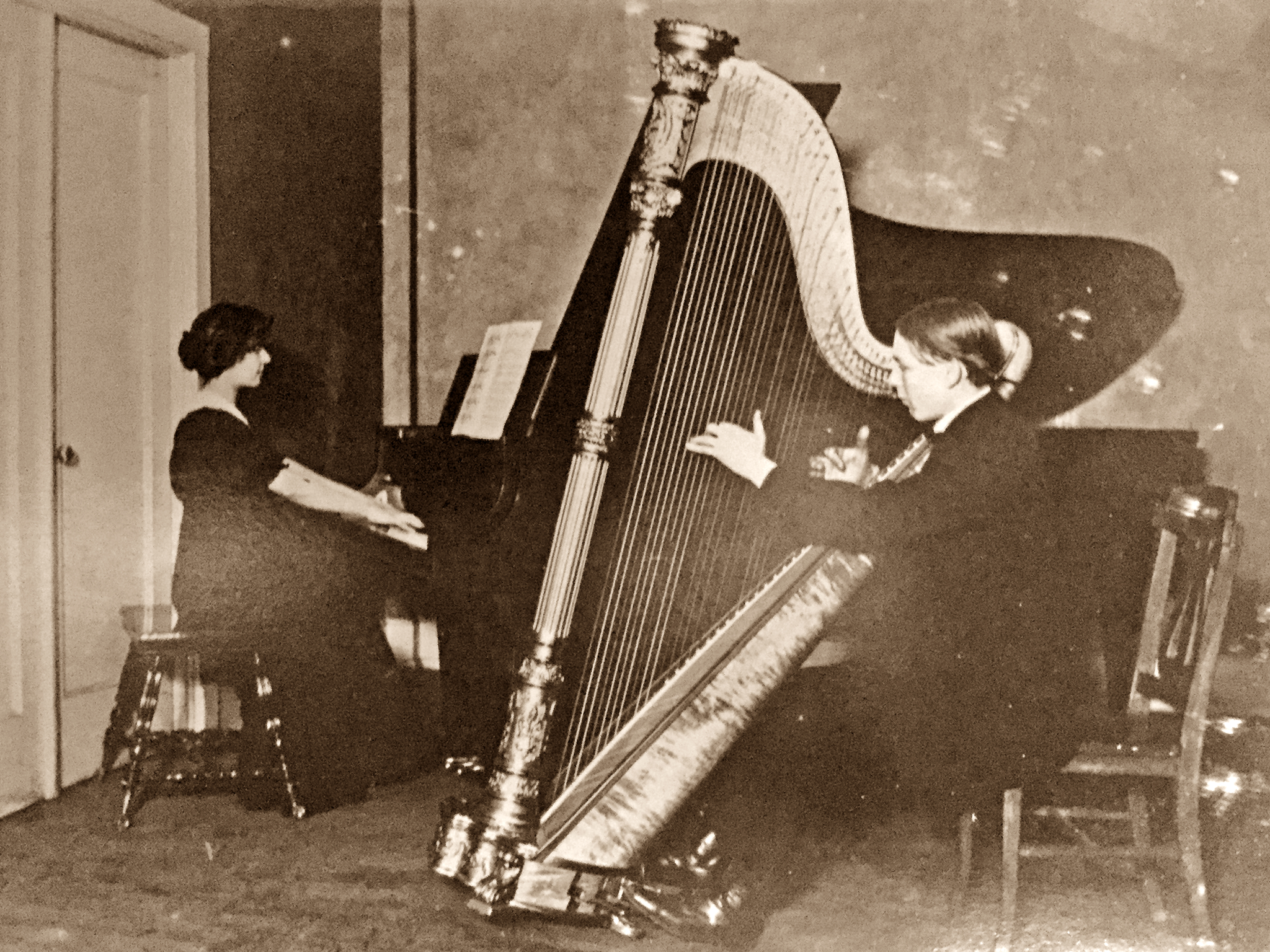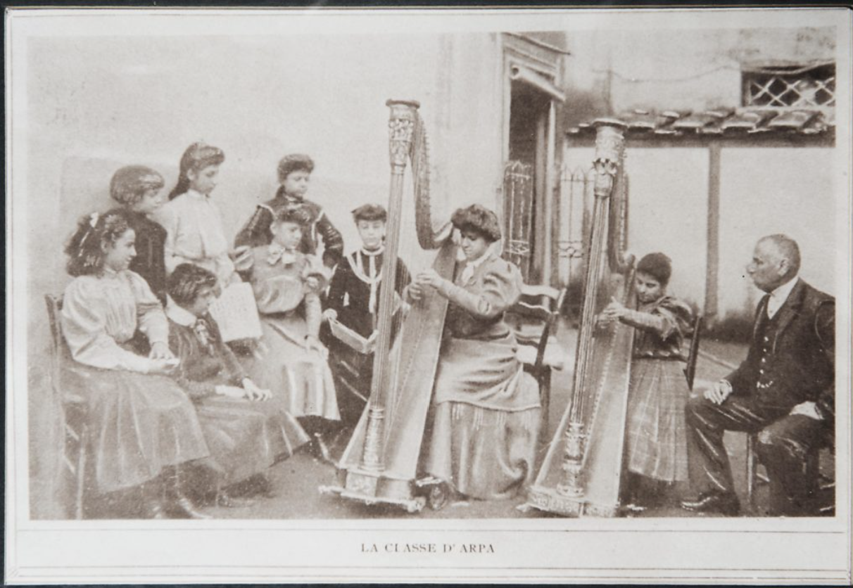 In the photograph on the side it is possible to see Giovanni Caramiello's harp class. On the right side there is Giovanni himself, but the harps that have been immortalized in this photo are interesting. According to expert harpist Sylvain Blassel14, the harp played by the oldest women could play on a Erard harp, greek style from London, double action, or another harp maker (Egan, Blazdell, etc) who made this Greek model15. As the photo was taken around 1905, a period in which the Erard harp was certainly already on the market and given that a real Erard harp shop will be opened later in Naples it is very likely that the left one will be an Erard.