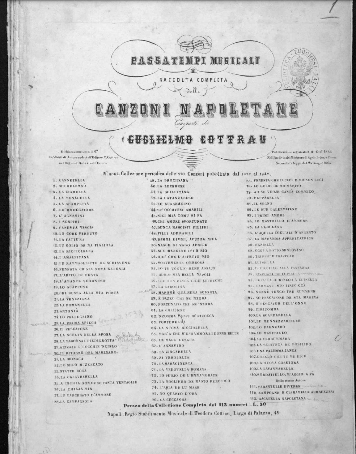 The first six books of Cottrau were an absolute novelty, quickly gaining popularity to the point of stimulating an editorial and production trend, with similar collections by other authors. In a short time, a repertoire that takes the form of a specific genre of vocal chamber music spread and, despite highlighting strong stylistic borrowings, both from cultured vocal production and from oral tradition, manages to define itself as an autonomous genre and to escape the hegemony of musical theater of era. In the salons of the aristocrazy or of the high bourgeoisie, melodies of opera live together with folk songs as Santa Lucia, Fenesta ca lucive, Palummella, Te voglio bene assaje…