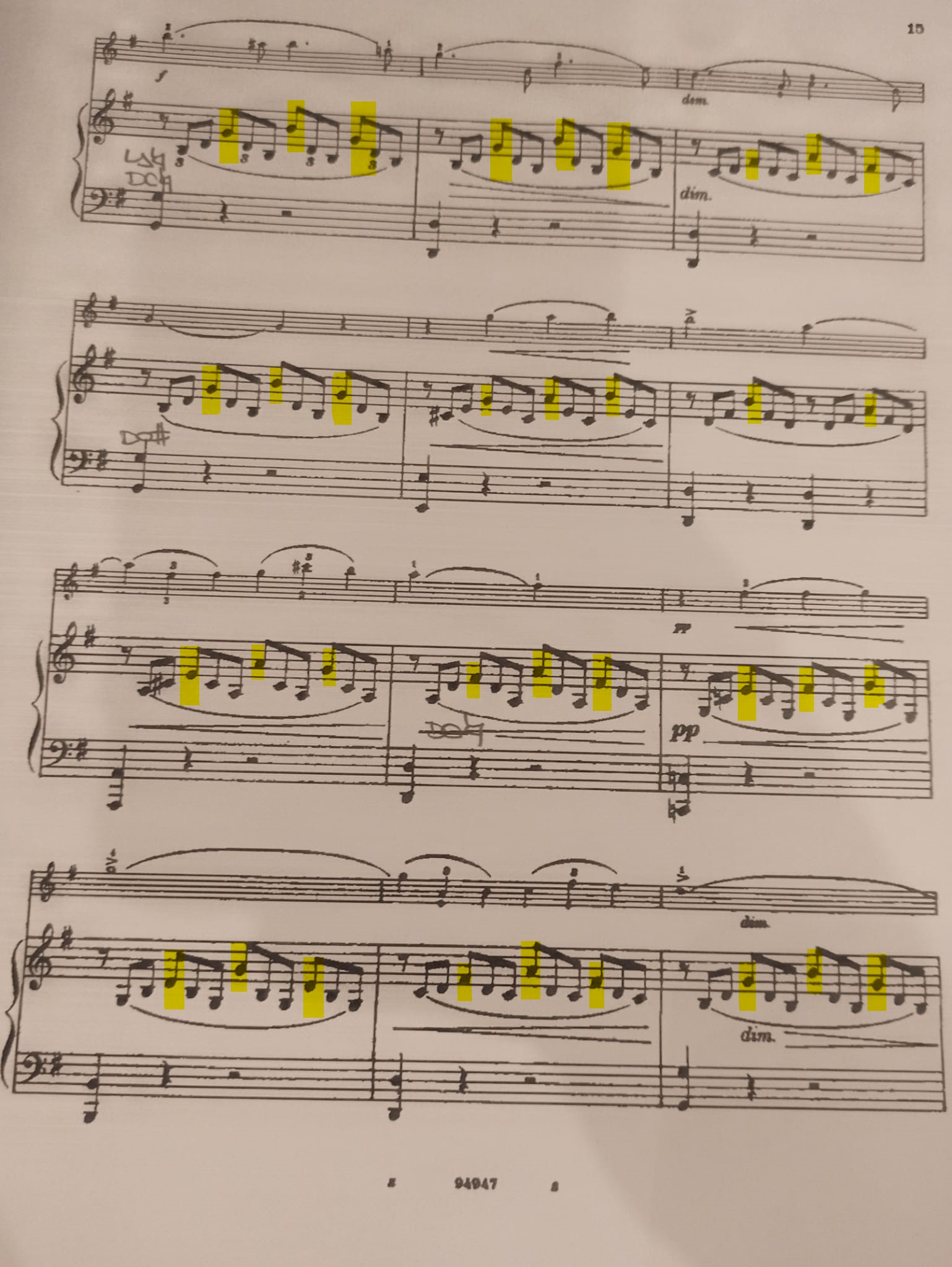 In this part the music is very pressing and a rhythm reminiscent of a waltz is resumed, but the general sensation is of having reached the pinnacle of a climax. In this part, in contrast, Munier does not take up the accompaniment of the original work, but gives a triplet rhythm to the piano. This rhythm really lends itself very well on the harp and when I saw this passage for the first time, I admit that I thought it was originally written for the harp. The triplet rhythm leads to accompaniment of the melody and creates a second melody with the highest note of each figure (highlighted notes).