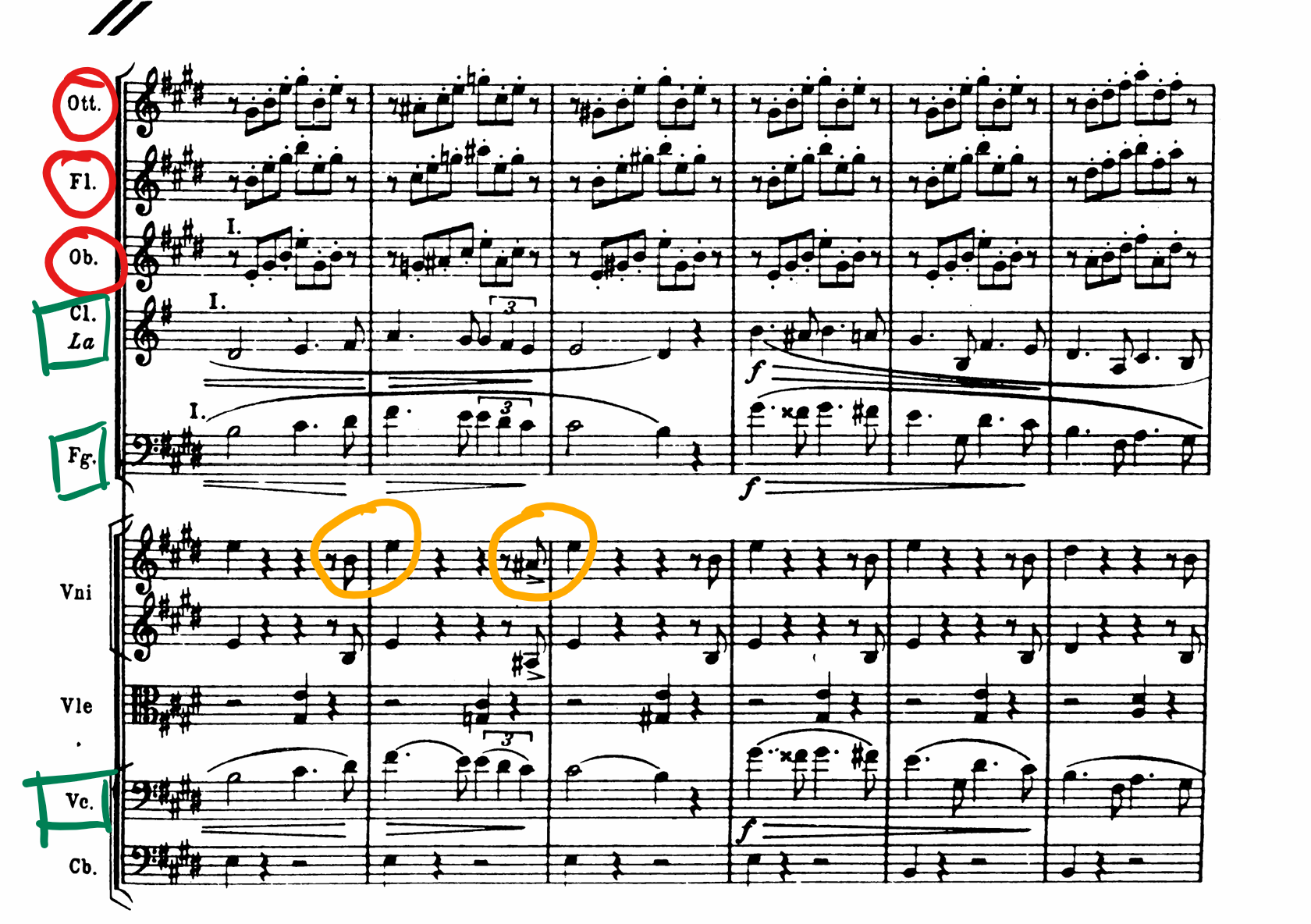 The second time the whole orchestra becomes part of this theme: the cello resumes its role, but it is also joined by bassoon, clarinet. A group of wind instruments that we have already met during the opera and which provides a decisive, warm and sweet timbre at the same time. In contrast, this time the theme is not accompanied by a triplet rhythm from the violas but rather chords in the form of arpeggios in eighth note rhythm given to piccolo, flute and oboe.