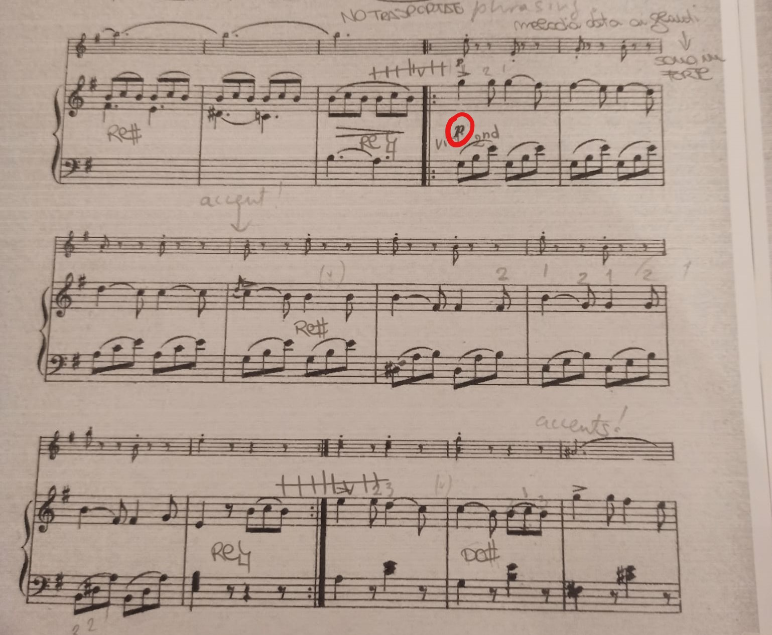 The theme is ceded to the mandolin in Munier's rhapsody, mandoline which until now had mainly accompanied the piano, while the piano is given the harmony with a rhythm that is very reminiscent of the march. Ideally, I would have liked to recall the idea of the distant choir that is present in the original also with the mandolin, but being a very weak instrument on a sound level and not being able to take advantage of important amplification during the concert and the recording5 we simply followed the score. However, this does not prevent us from interpreting the first passage with the appropriate amplification, adding (at least in the recording) an effect to convey the sense of distance.