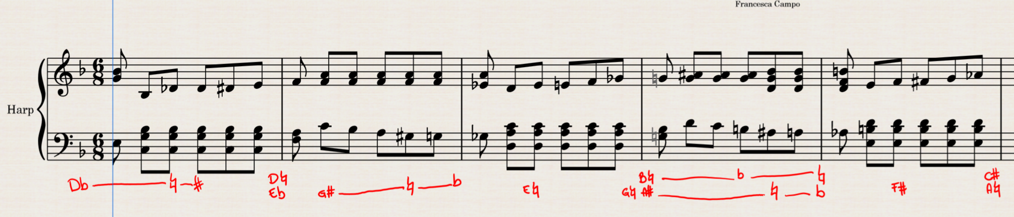 It is possible to see the passage rewritten as it can actually be played on the harp (image 6), with the writing of the pedals. This solution is not unique, in fact I have found more than one but I think it is the most convenient for evidencing noises due to pedal changes and reduces the problems of repeatedly playing the same note, a technique which is not convenient on the harp and not very effective.