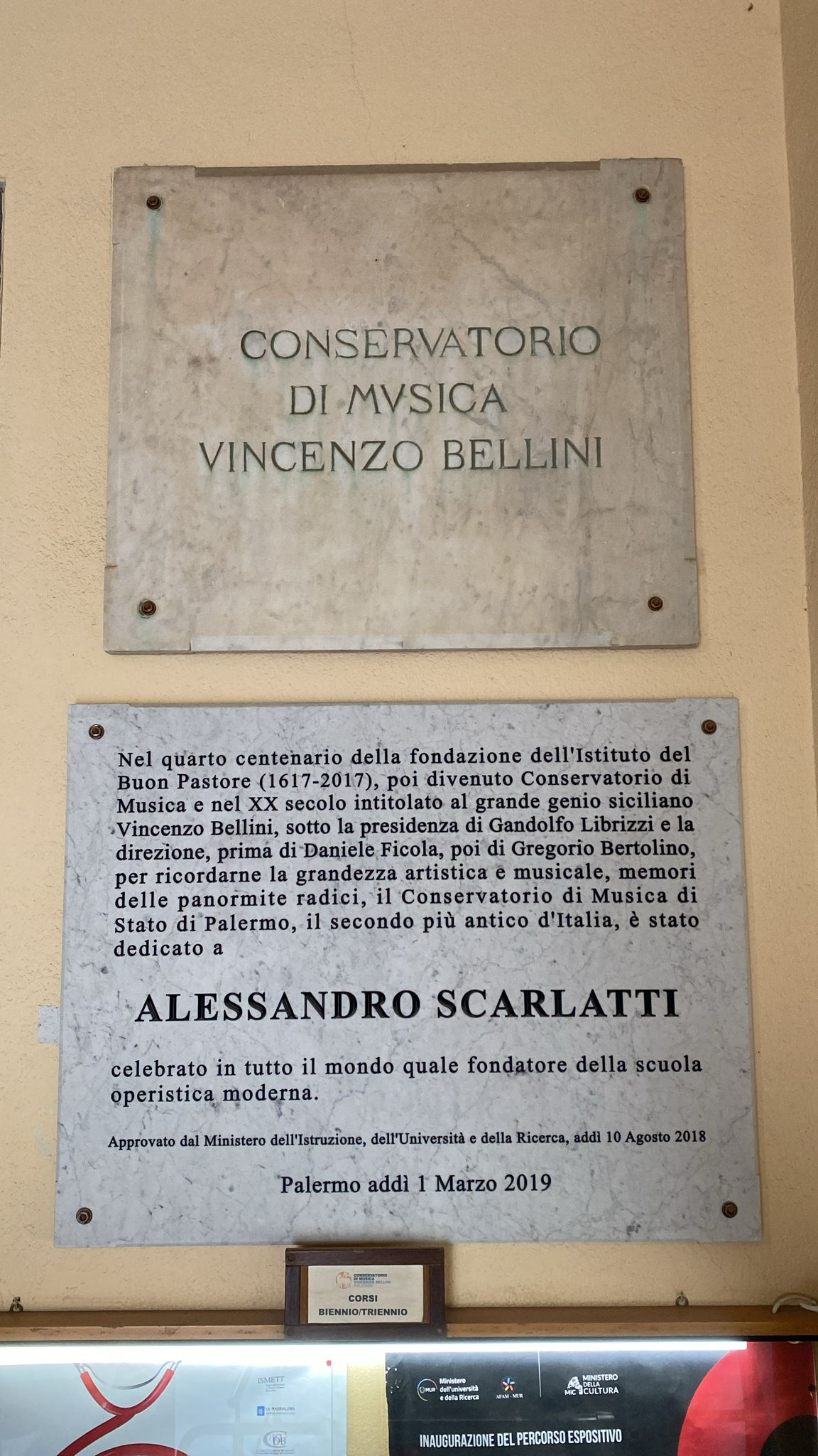 "On the fourth centenary of the foundation of the Istituto del Buon Pastore (1617-2017), which later became the Conservatory of Music and in the 20th century was named after the great Sicilian genius Vincenzo Bellini6, under the presidency of Gandolfo Librizzi and the direction, first of Daniele Ficola, then of Gregorio Bertolino, to remember his artistic and musical greatness, mindful of his Panormite roots, the State Conservatory of Music of Palermo, the second oldest in Italy, was dedicated to