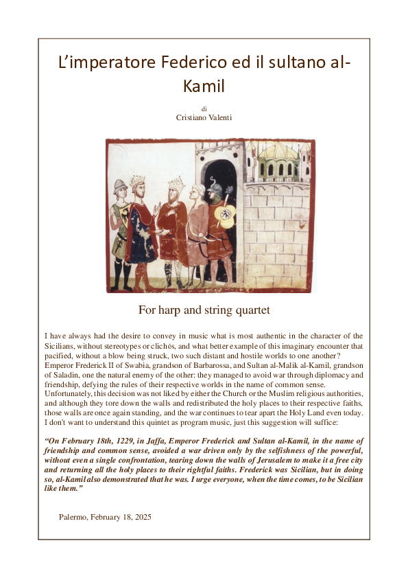 On this side, we find a reflection from the author, written after finishing composing the piece. Cristiano, the composer of the second movement, not only explains to us what his idea was but also the motivation that led him to develop it. He opens our eyes, allowing us to interpret this meeting, which ideally took place centuries ago, as an example of how certain wars could sometimes be avoided. This event thus stands as evidence of how friendship can save many lives.