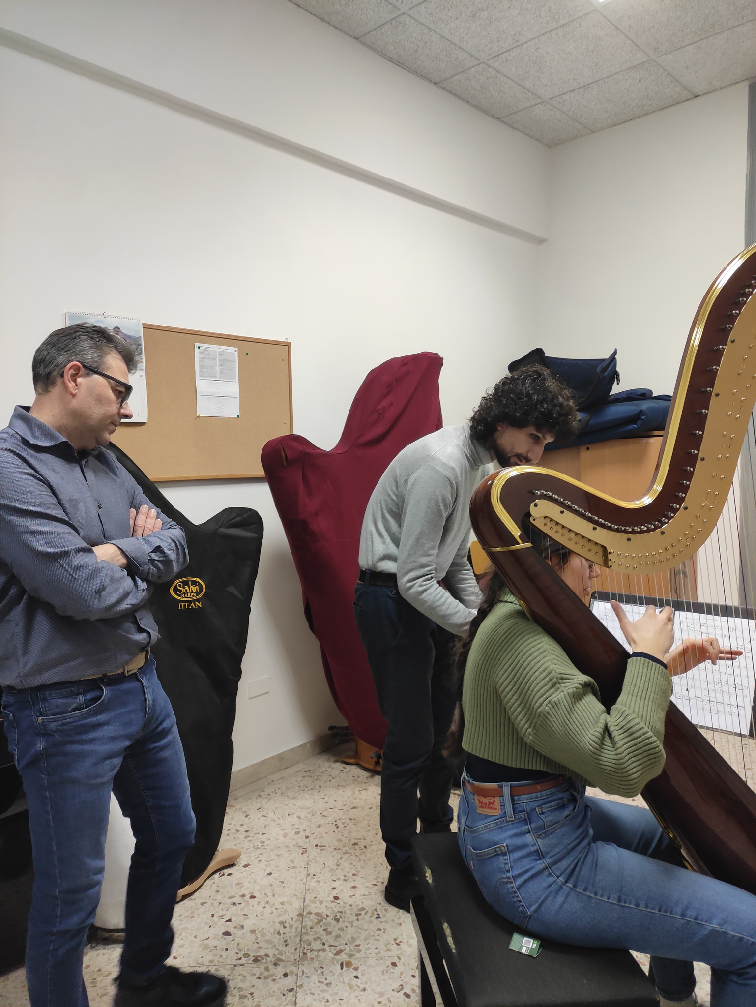 The first meeting with Cristiano was on December 16, 2024. The meeting took place at the Conservatory of Palermo, where we read the first draft of the piece together with the teacher Loris Capister. We first read through the piece to check that everything was actually playable on the harp. Then, a second reading to give me a clearer idea of his expressive and compositional vision, taking a look at the score (therefore at the part of the quartet) to understand the sound timbre that would be created.
