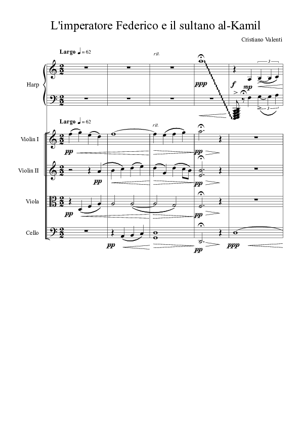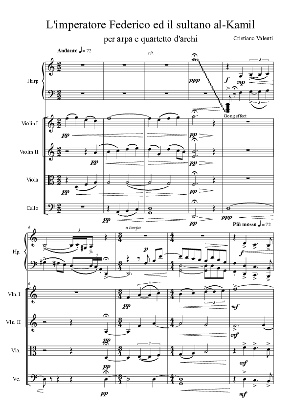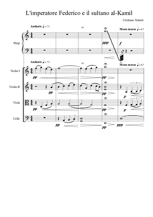 Cristiano, therefore, told me that he would have preferred to compose the piece without the male voices (at the beggining actually he declared wanting to compose for an ensemble that also includes two male singers, in the form of a dialogue between Frederick II and Al-Kamil during the Sixth Crusade.), because harp and quartet would have gone better with his final idea. In the following video, Cristiano, listening to the movement, reveals step by step what his compositional ideas were and explains them.