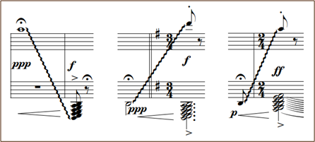 H: The harp takes up an ostinato similar to section D but with a darker character. The strings play oriental melodies, briefly hinting at Theme III, which culminates in a crescendo with a crossed glissando from the harp.