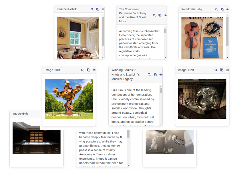 The etymological choice, derived from the combination of the Greek terms “koinos” (κοινός), meaning “common” or “shared,” and “bios” (βίος), meaning “life” or “existence,” reflects an educational approach that embraces the notion of an ecosystem applied to learning contexts and digital archiving based on collective intelligence. Indeed, students, under the supervision of professors, can actively contribute to expanding °'°Kobi by creating projects within the Research Catalogue, a database that forms the platform’s knowledge base through a collaboration with the Society for Artistic Research.