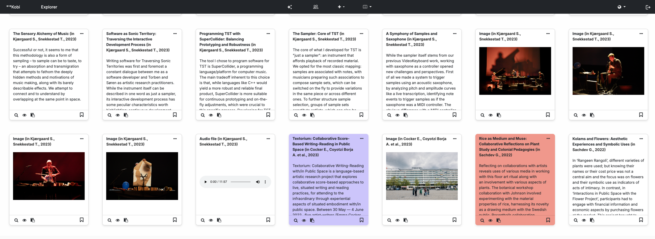 °'°Kobi is a Knowledge Management System conceived as a vast associative memory. Currently, its knowledge base is integrated with the Research Catalogue, a database dedicated to artistic research structured into expositions. In °'°Kobi, an exposition represents a complex unit of knowledge that combines text (with a mandatory abstract), images, and sounds, offering an articulated presentation of the results of artistic research.