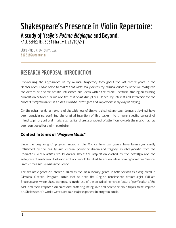It is, in other words, the curiosity that arises within myself that makes me want to discover the depths of Ysaÿe’s musical language that is so very unique from the rest of his contemporaries and how he inspired himself to create this monumental musical poem. By studying, analyzing, practicing, performing, showing, disseminating and disclosing his “Poeme élégiaque” op.12 as the working process of this paper and core piece of my research, I think I would be able to understand and explore what the program music offered to the violin literature during Ysaÿe’s times.