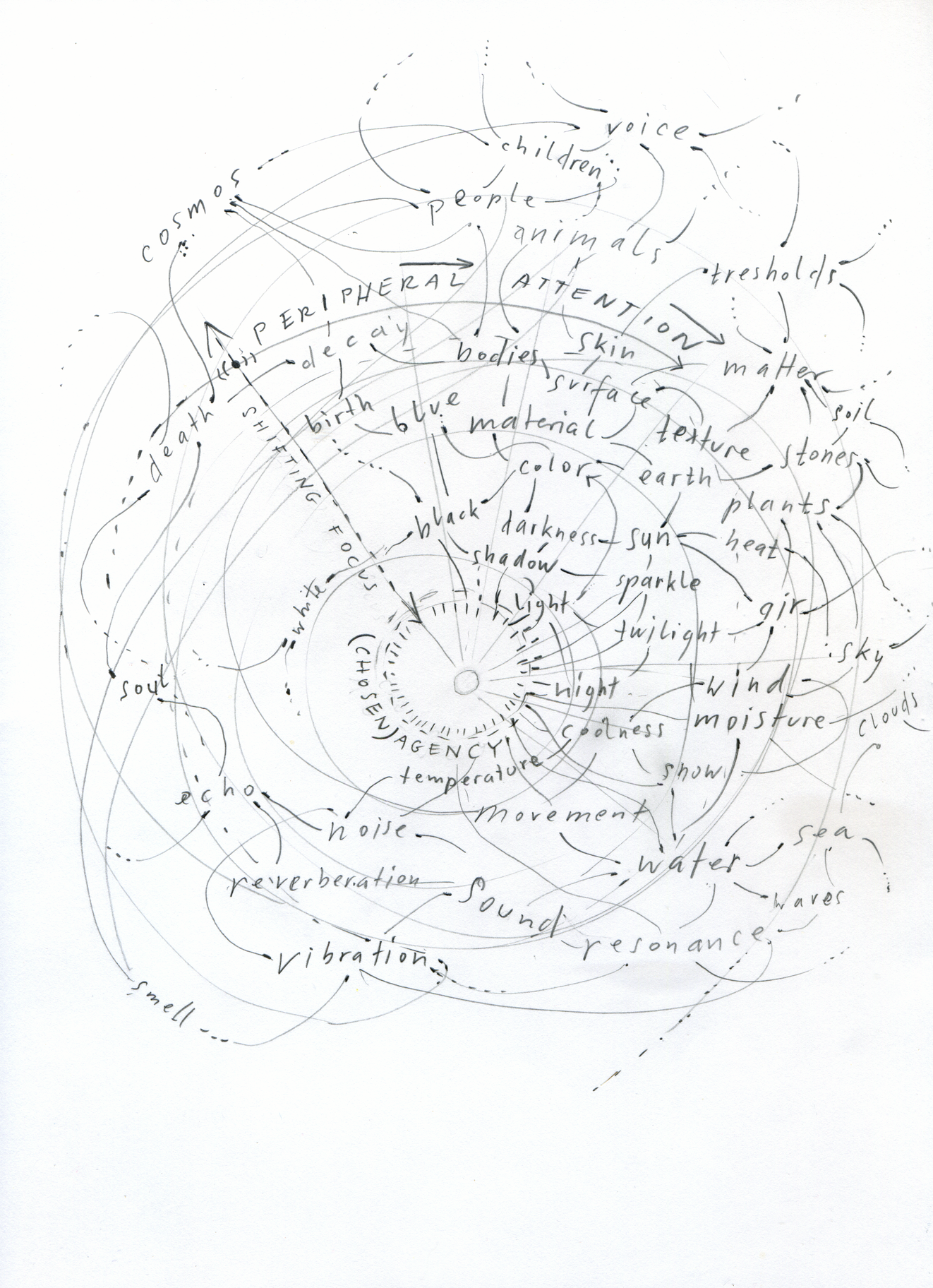 Here, a writing-drawing emanates, overwrites, and configures. It is in this open field that a practice of diagraming life lines situates itself, tracing the jolty ruptures of me, the fluid transitions of you, the hairline cracks of us, fog-holes of them, and deep shallows of it—where unknown forces emerge, quietly infiltrating the scene, only to vanish as suddenly as they have appeared. Ghostly, elsewhen, at ween, spirited away.