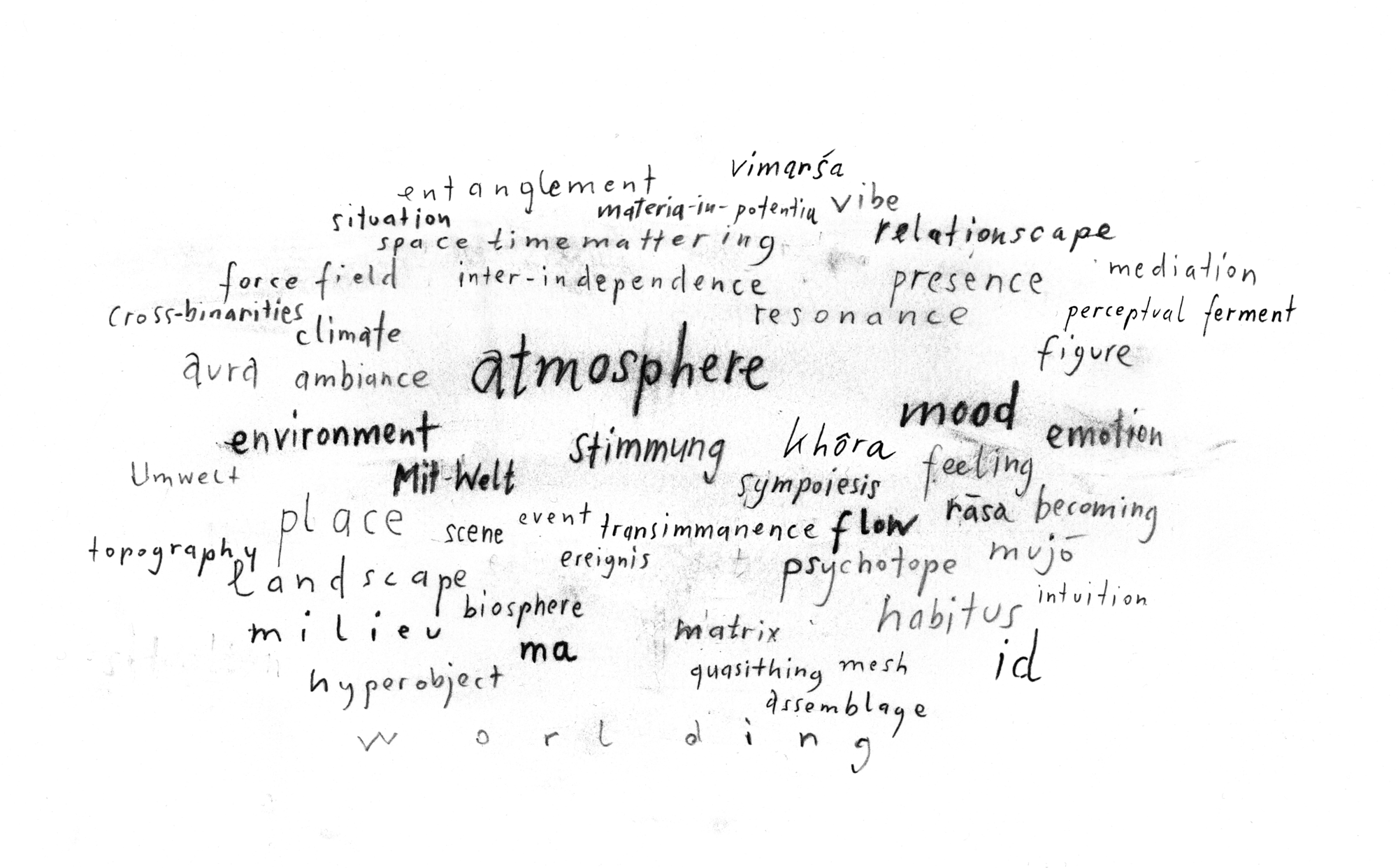 The German term Stimmung, comes even closer to the phenomenon that we are approaching. Stimmung connects the so-called “inner” felt Gestimmtheit (feeling, mood, emotion, flow…) with the effect of a specific situation that is supposedly experienced “outside,” (atmosphere, environment, place, landscape, topography…) and its emergent, process-based character (worlding, spacetimemattering, relationscape, sympoiesis…). The Stimmung bears the Stimme (the voice) within it; speaks, sings, swings, is in communication, in resonance with the world. Stimmung brings those inner and outer phenomena, which supposedly exist separately, into constant, mutually-conditioning interaction, into dialogue with one another, to maneuver into this ambigious resonance space in favor of a dissolution of the subject-object split.