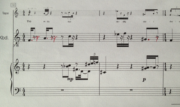 Playing material on a synthesiser demands the skill of playing the piano to make the samples work in a performance situation, to get them to sound like musical material. It is not a matter of ‘depressing a key.' In the case of at the tips of my fingers / at the tip of my tongue I added articulations to the score to integrate the samples into the musical setting. In other words, the samples also need performance instructions and activating them needs to be considered as much of an artistic act as playing a conventional instrumental.