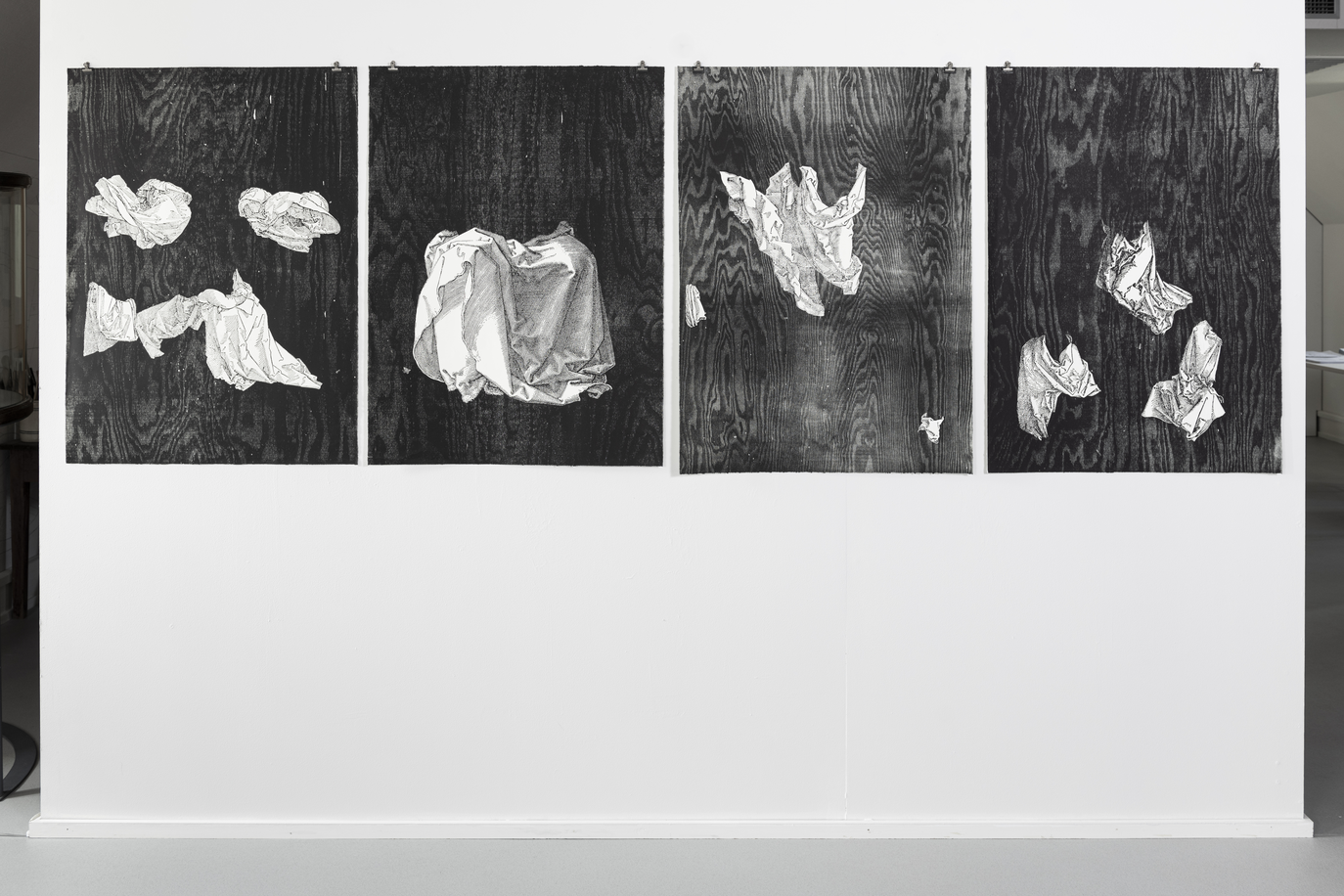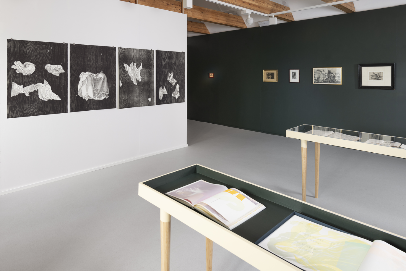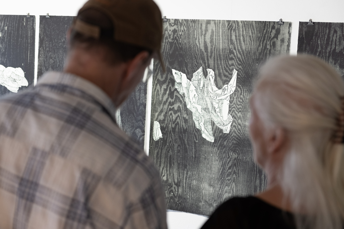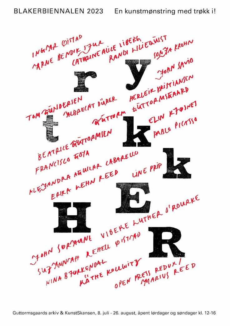 Trykk her er kuratert av kunstnerne Erika Lehn Reed og Suzannah Rehell Øistad, som er verksmestere ved Guttorm Guttormsgaards grafikkverksted på Blaker gamle meieri.