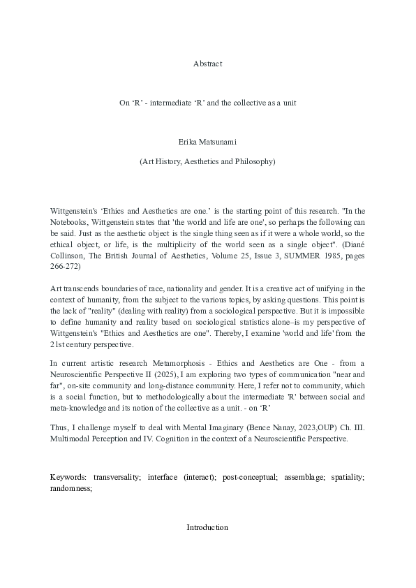 In current artistic research Metamorphosis - Ethics and Aesthetics are One - from a Neuroscientific Perspective II (2025), I am exploring two types of communication "near and far", on-site community and long-distance community. Here, I refer not to community, which is a social function, but to methodologically about the intermediate 'R' between social and meta-knowledge and its notion of the collective as a unit. - on ‘R’