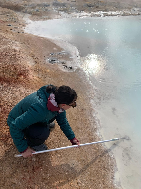 To collect the samples I used a metal spoon taped to an aluminum rod to not get too close to the boiling areas. The samples were placed in zip-lock bags. They were not as hot as I previously expected. If gathered from the sides of the pools the clays are not hot enough to worry about burning. As I later learned, the chance of acid burns is high when collecting these materials. As I did not wear gloves my skin did suffer mild acid burns.