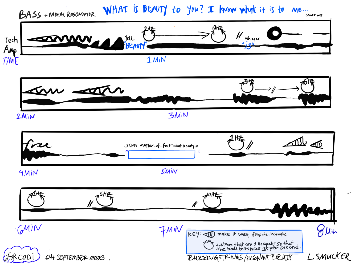 This work follows two avenues: one asks a question of the performer: What is beauty for you? And asks the performer to come up with a response on the spot during the performance. The second is supposed to suggest what I think is beauty through the example of the piece.