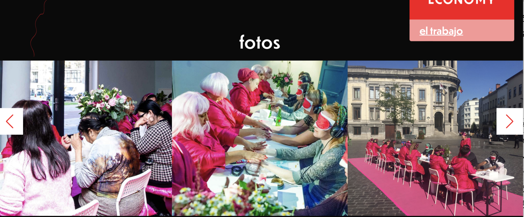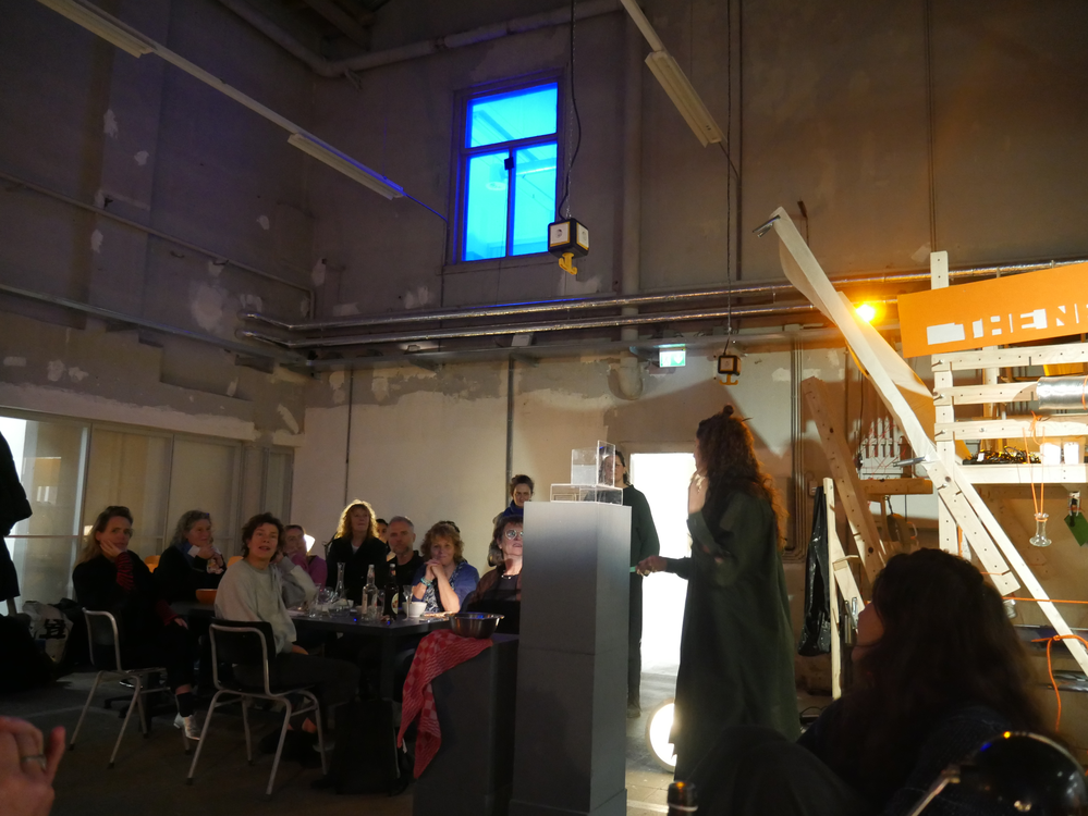 The Beauty Verhalen Salon premiered at the Women Inc. festival at the Beurs van Berlage in Amsterdam. Some interviewed women spontaneously reported to play with us in the installation. Pink veiled in Zina dress behind the tables, to massage the hands of the audience who listens blindfold to their intimate life stories.
