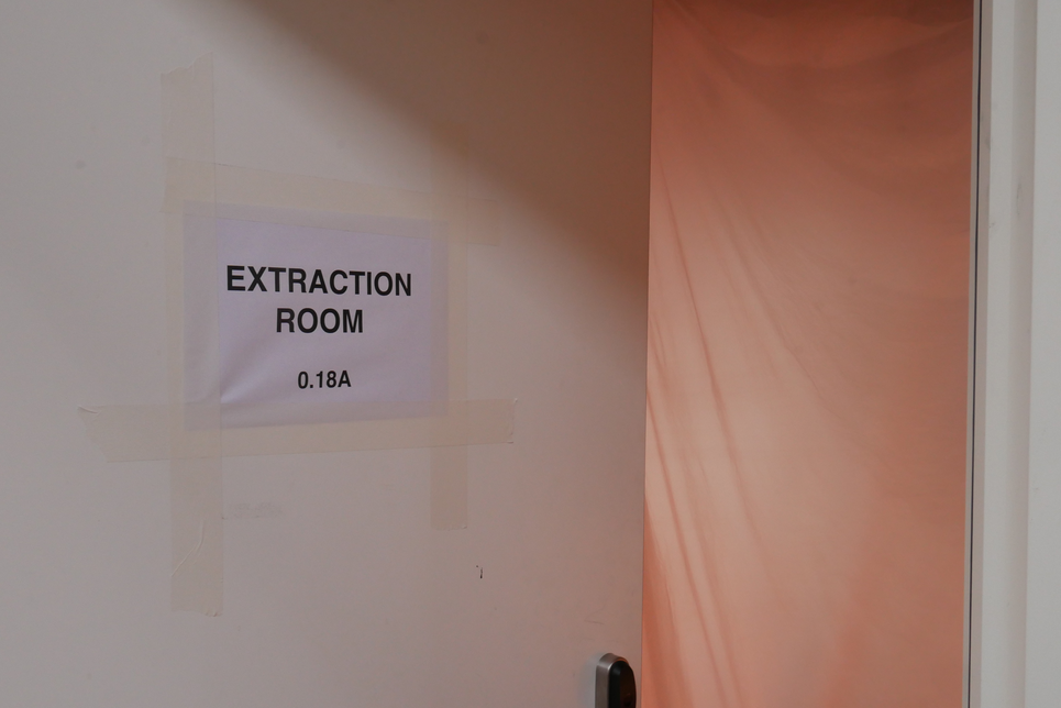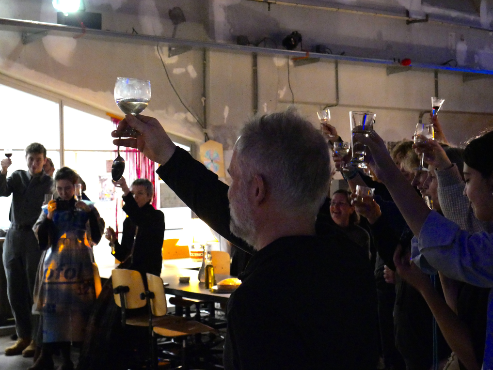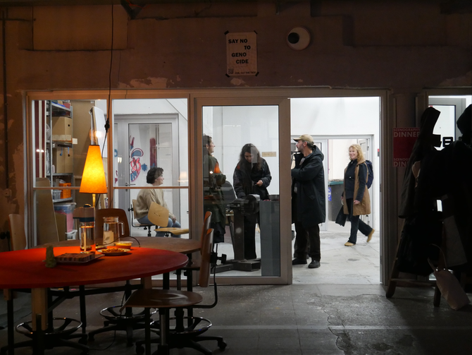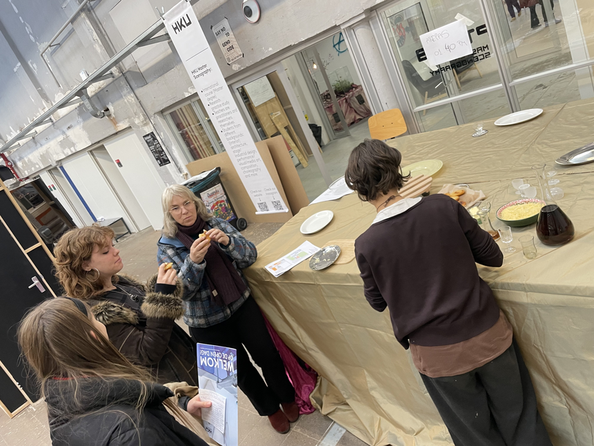 Some of the Furnitures populating the space during the Open kitchen Weekender (17—19 October 2024) come from a collective attempt to practice DIY with care and appreciation for each other's skills and ideas. They are built with waste material found around the storages of BAK by artist and carpentry wizard Gerardo Gomez Tonda. The banner is painted by b.a.k. comrade and graphic Berend Bombarius.